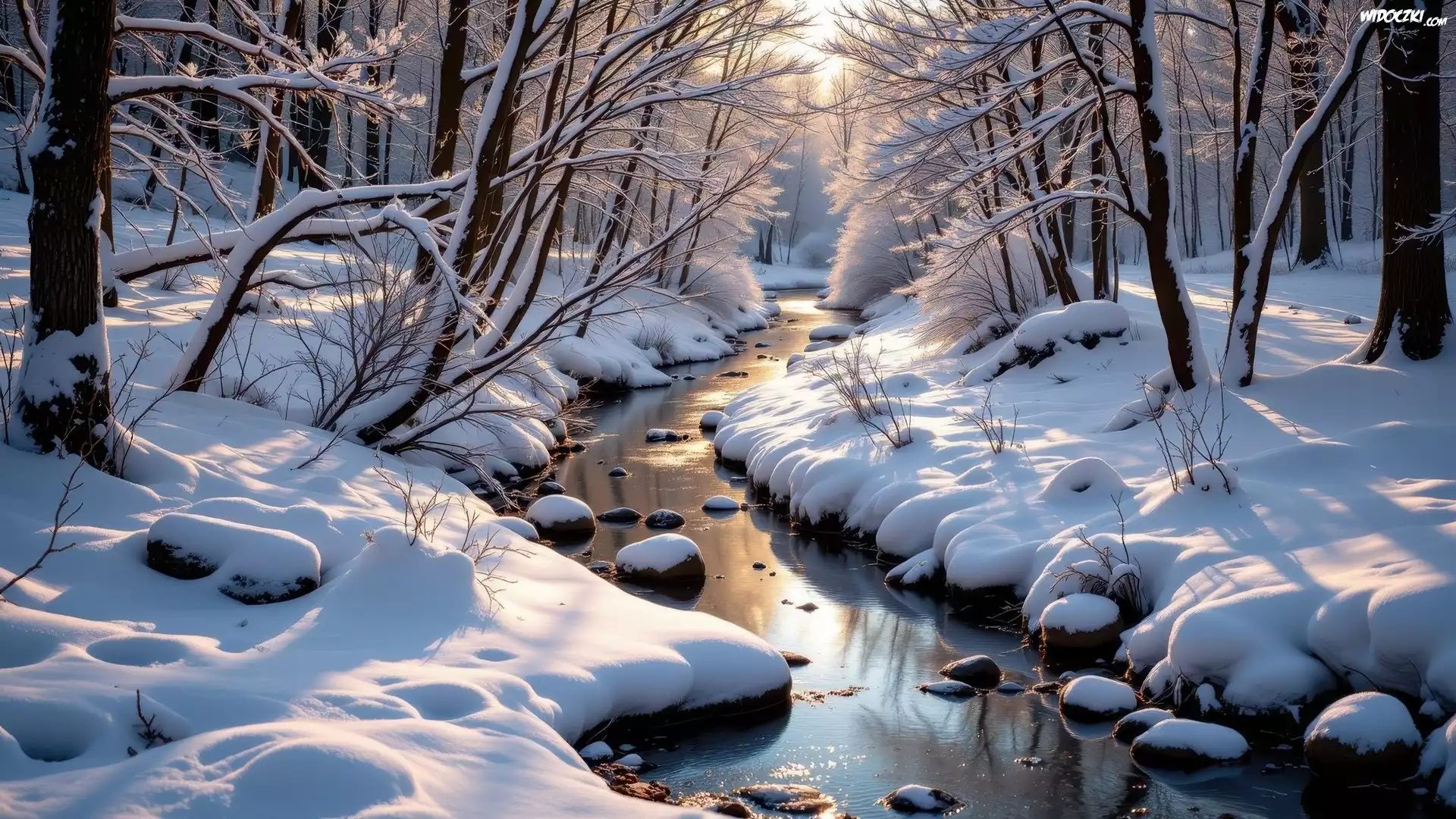 Zdjęcia, Zima, Las, Rzeka, Ośnieżone, Drzewa, Gałęzie