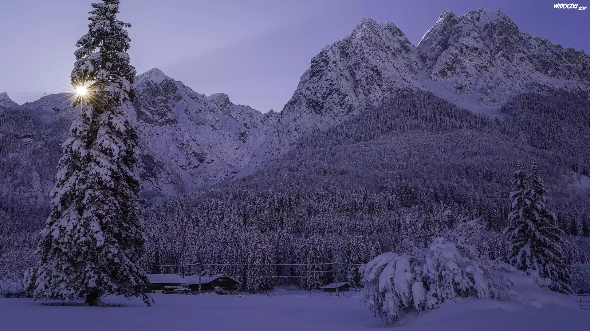 Zdjęcia, Zima, Las, Góry, Ośnieżone, Drzewa, Domy, Słońce