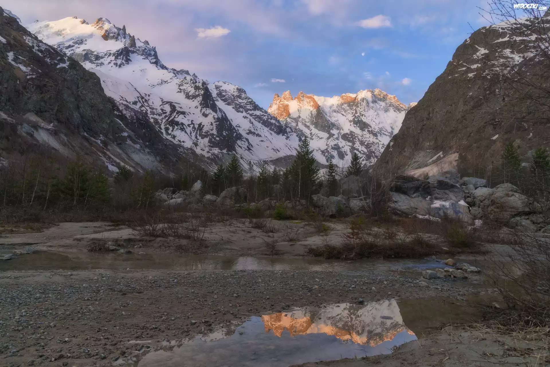 Zdjęcia, Ośnieżone, Góry, Drzewa, Kamienie, Kałuże