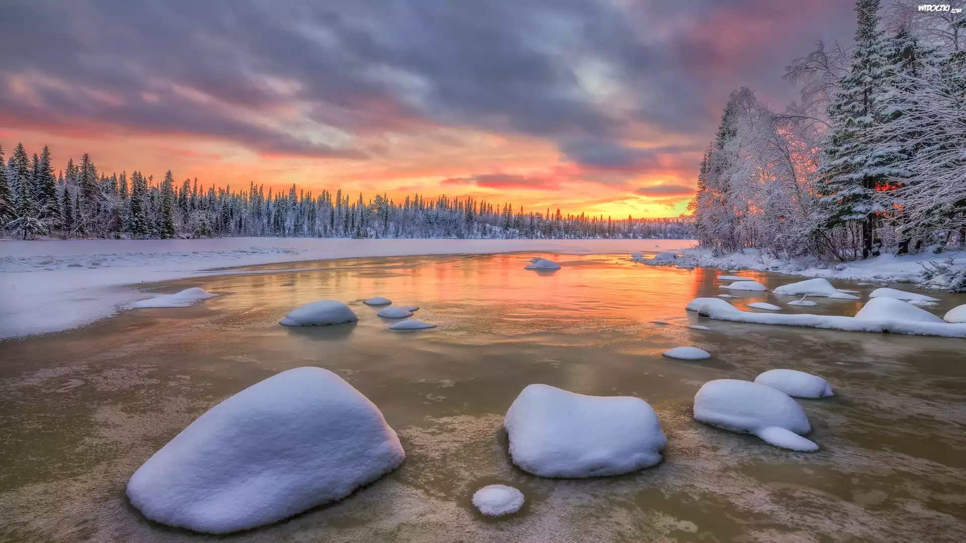 Rzeka, Drzewa, Kamienie, Ośnieżone, Zima, Zachód słońca