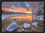 Zdjęcia, Rzeka, Drzewa, Kamienie, Ośnieżone, Zima, Zachód słońca