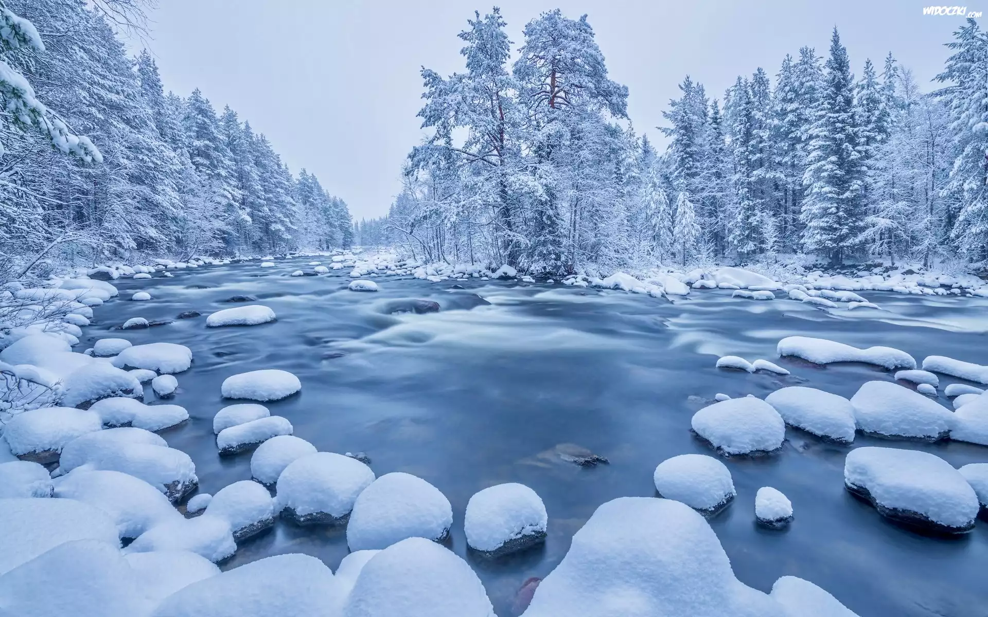 Zdjęcia, Rosja, Półwysep Kolski, Zima, Rzeka Kola, Drzewa, Ośnieżone