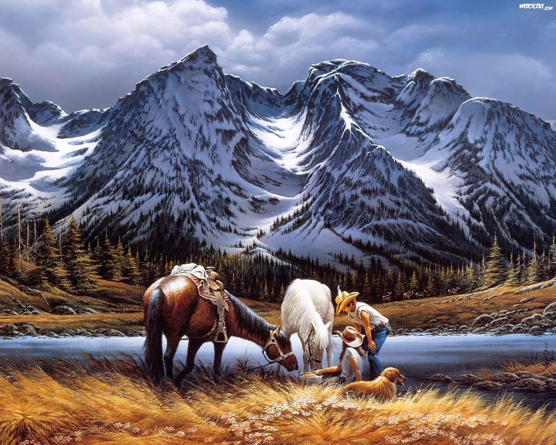 Ośnieżone, Góry, Łąka, Konie, Malarstwo