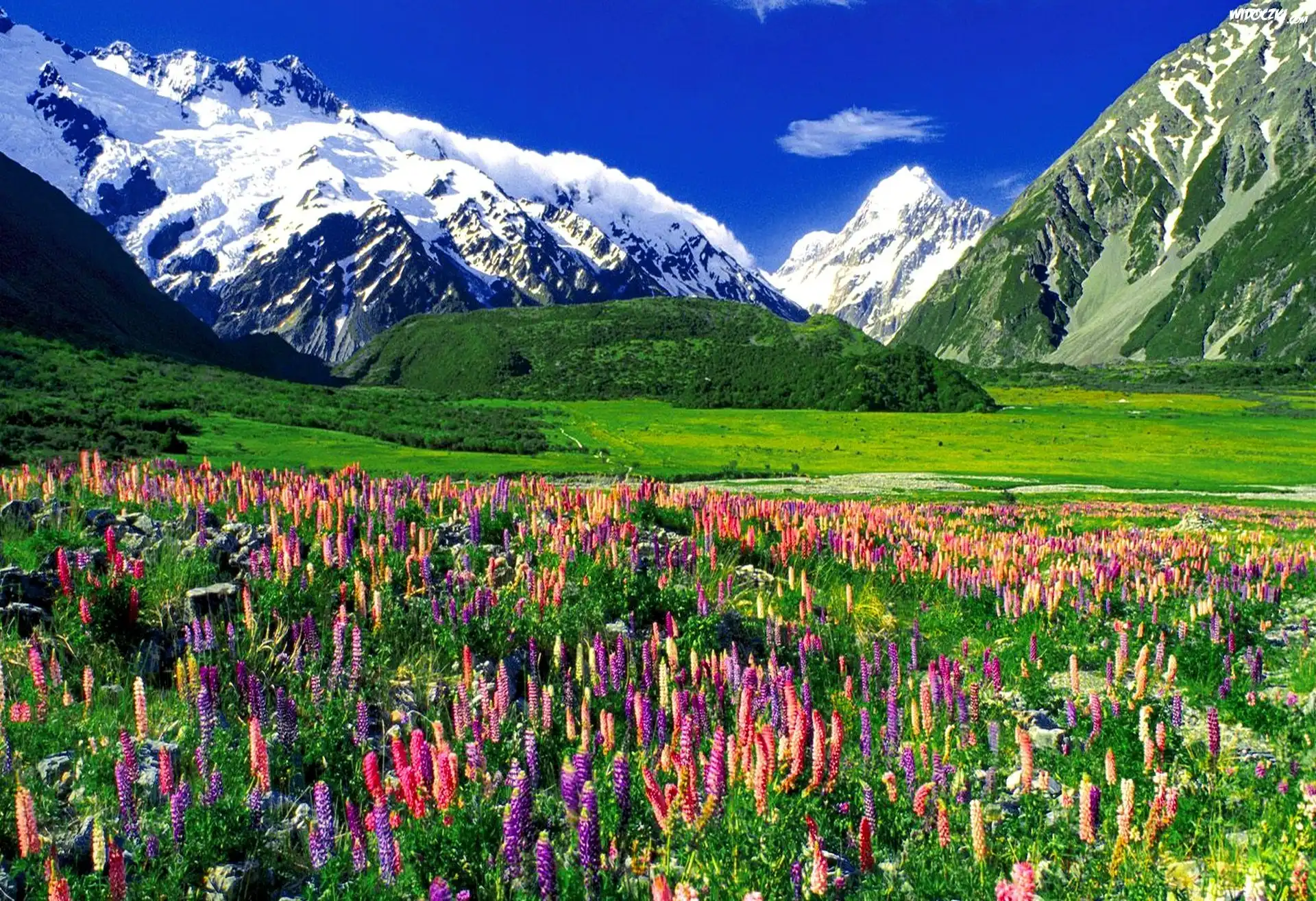 Zdjęcia, Łąka, Kwiaty, Ośnieżone, Góry