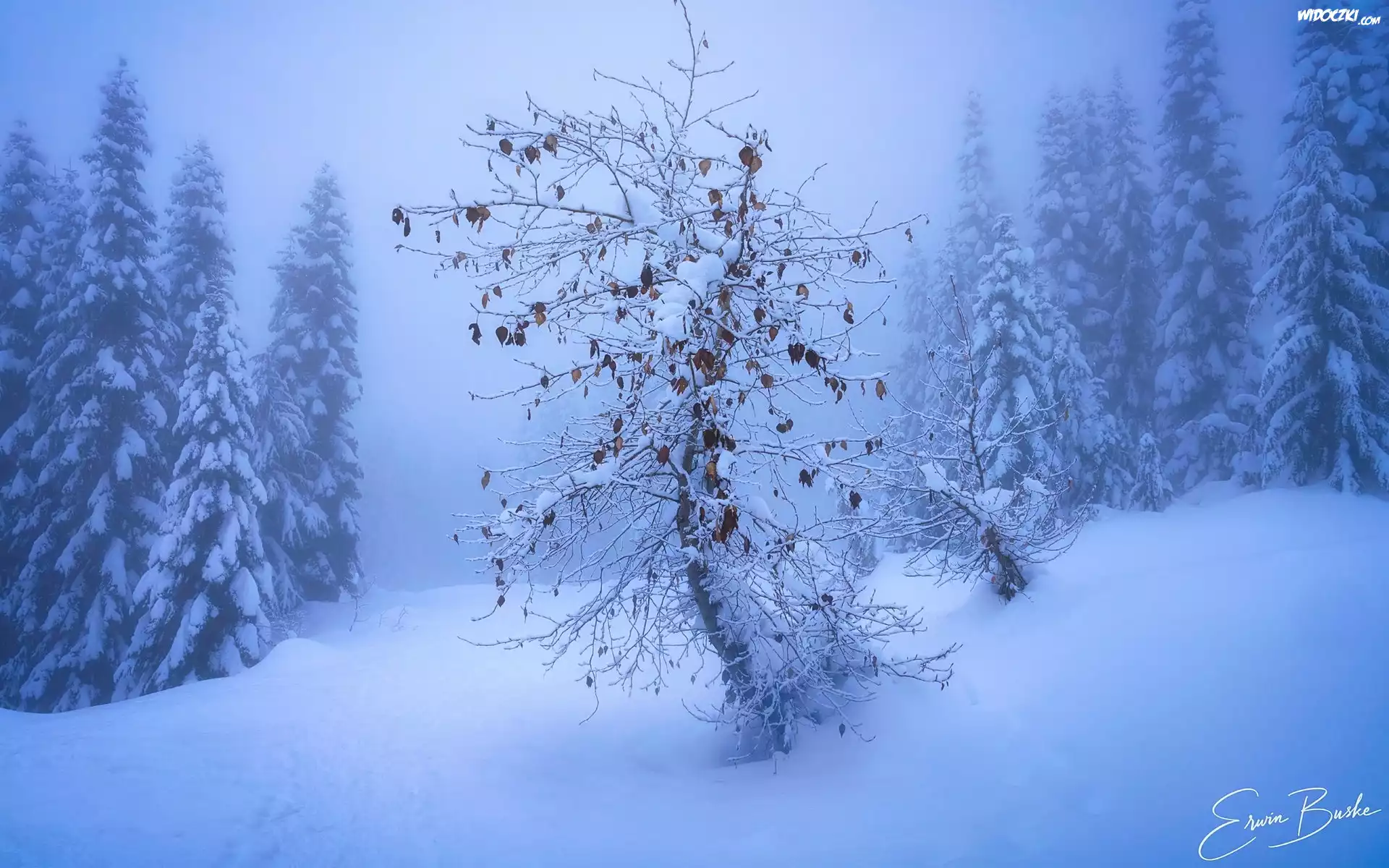 Zdjęcia, Zima, Zaspy, Śnieg, Ośnieżone, Drzewa, Mgła