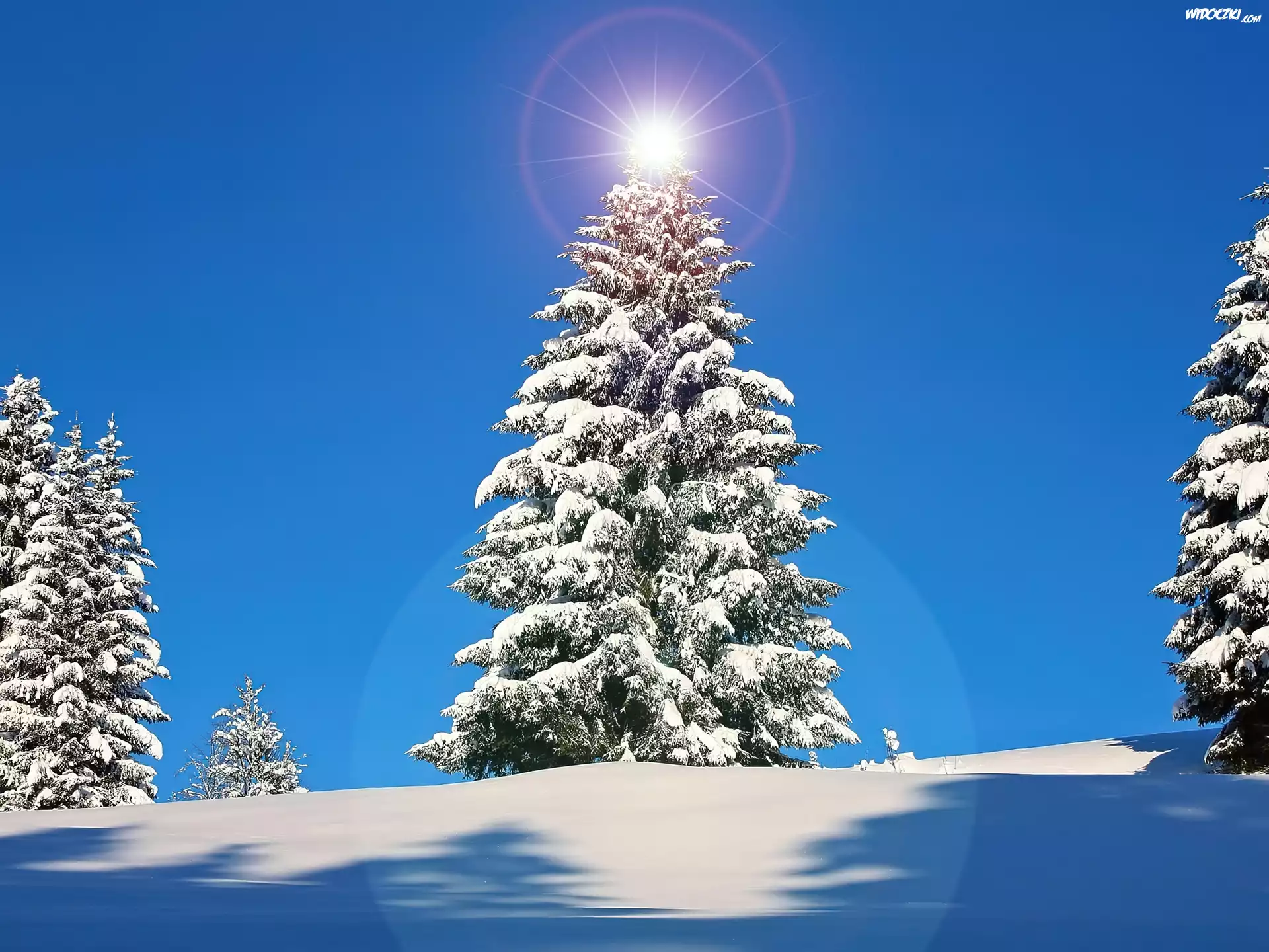Zdjęcia, Ośnieżone, Choinki, Niebo, Słońce