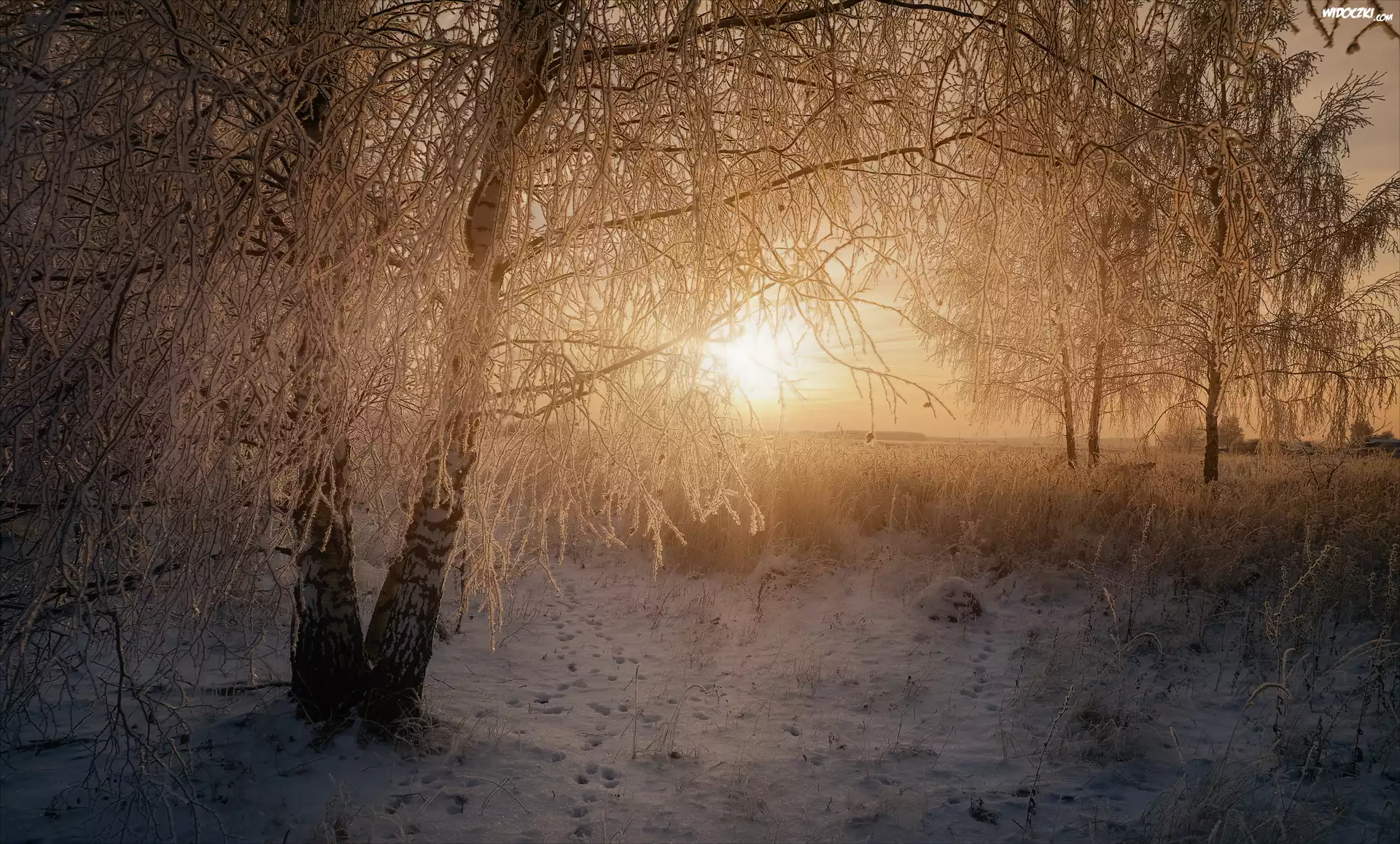 Oszronione, Ośnieżone, Drzewa, Trawa, Zima, Wschód słońca