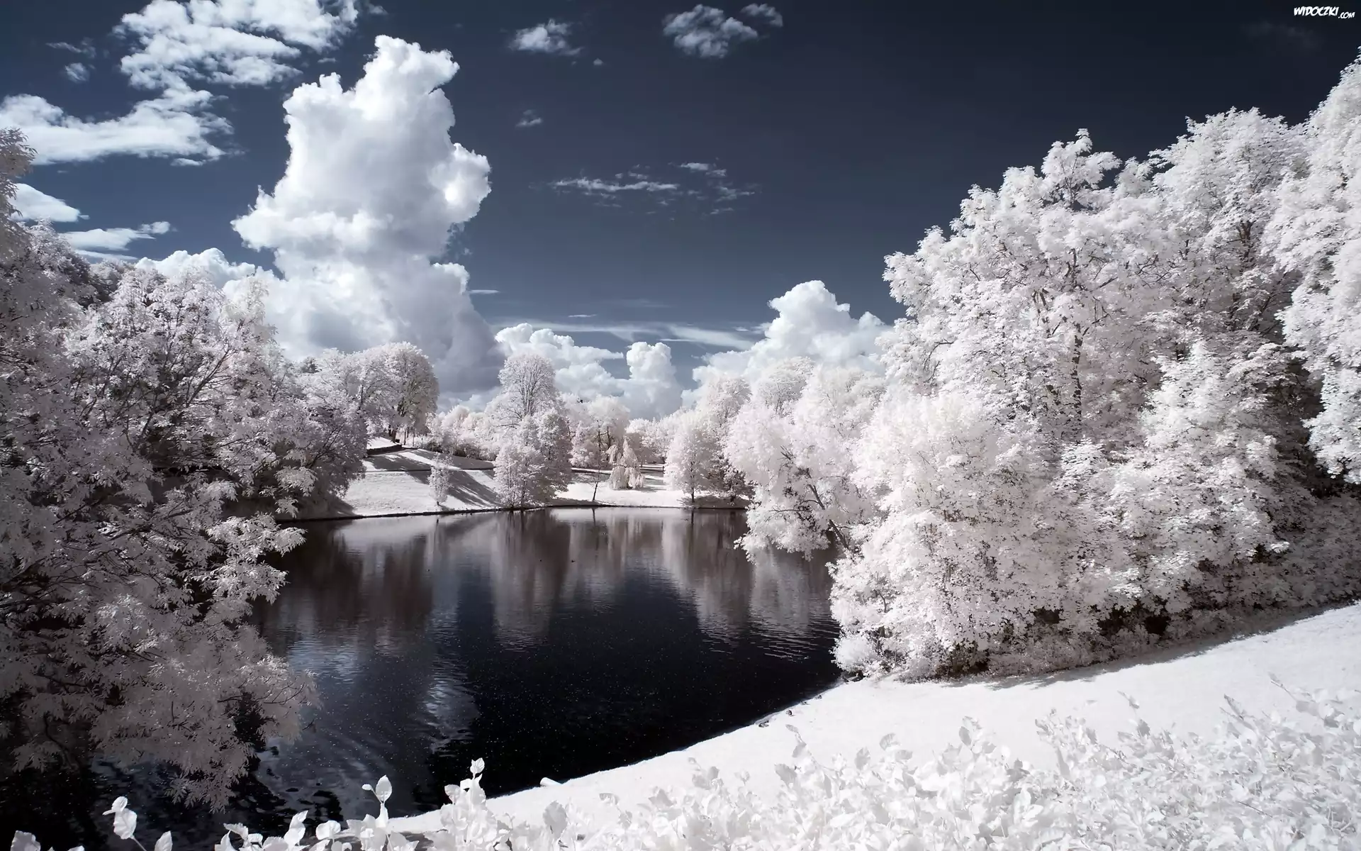 Ośnieżone, Drzewa, Staw, Park, Chmury