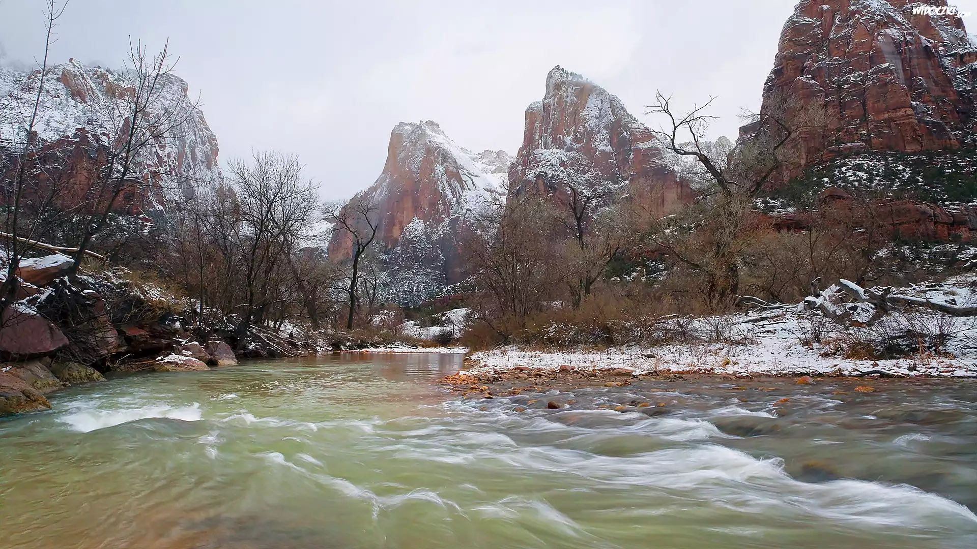 Zdjęcia, Ośnieżone, Skały, Rzeka, Drzewa