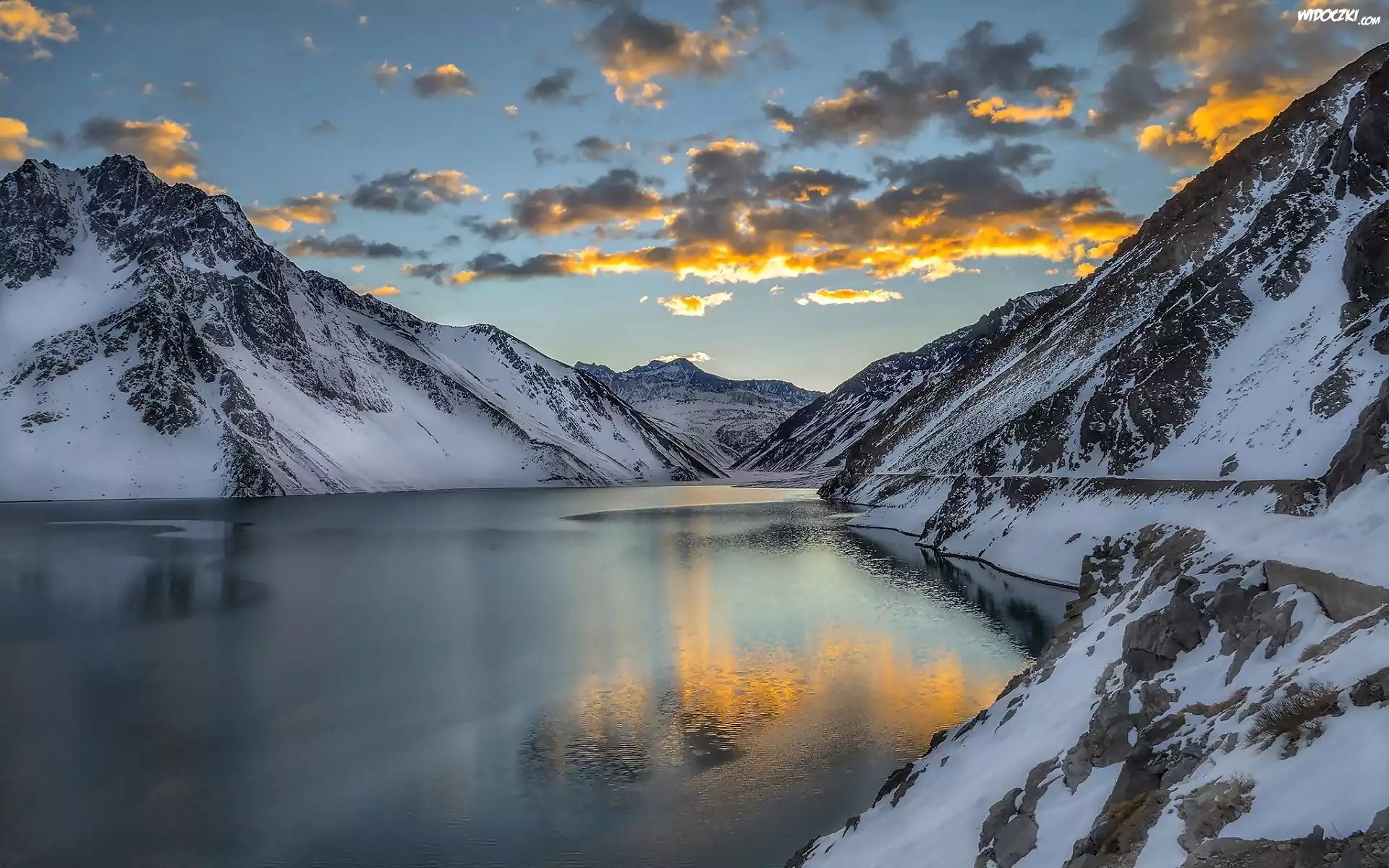 Zdjęcia, Ośnieżone, Góry, Jezioro, Zachód, Słońca, Obłoki