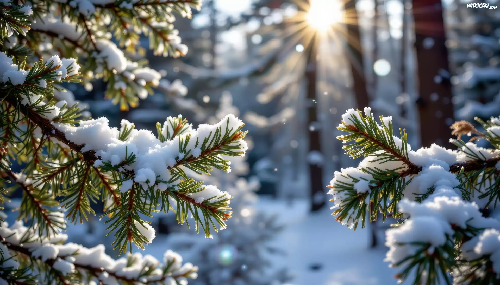 Zdjęcia, Ośnieżone, Gałązki, Świerk, Zima, Las, Promienie słońca, Grafika AI