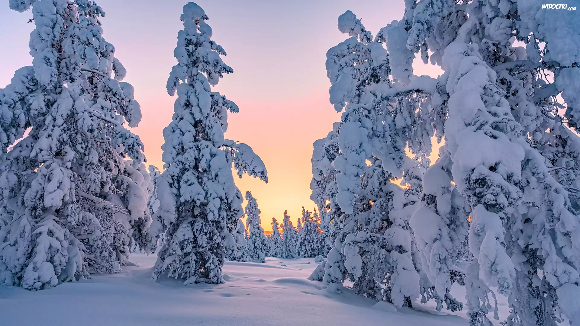 Ośnieżone, Drzewa, Świerki, Wschód słońca, Zima