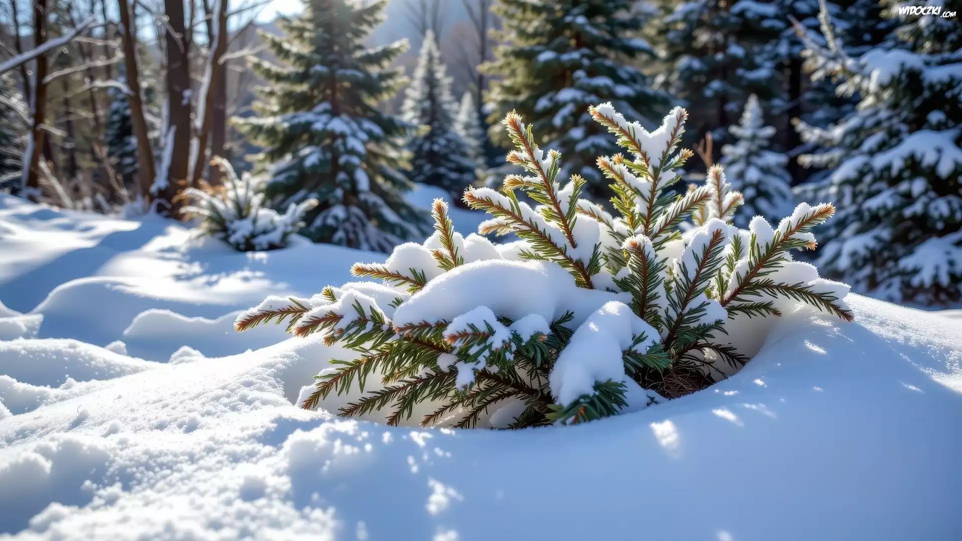 Zdjęcia, Zima, Las, Śnieg, Ośnieżone, Gałązki, Iglaki, Drzewa