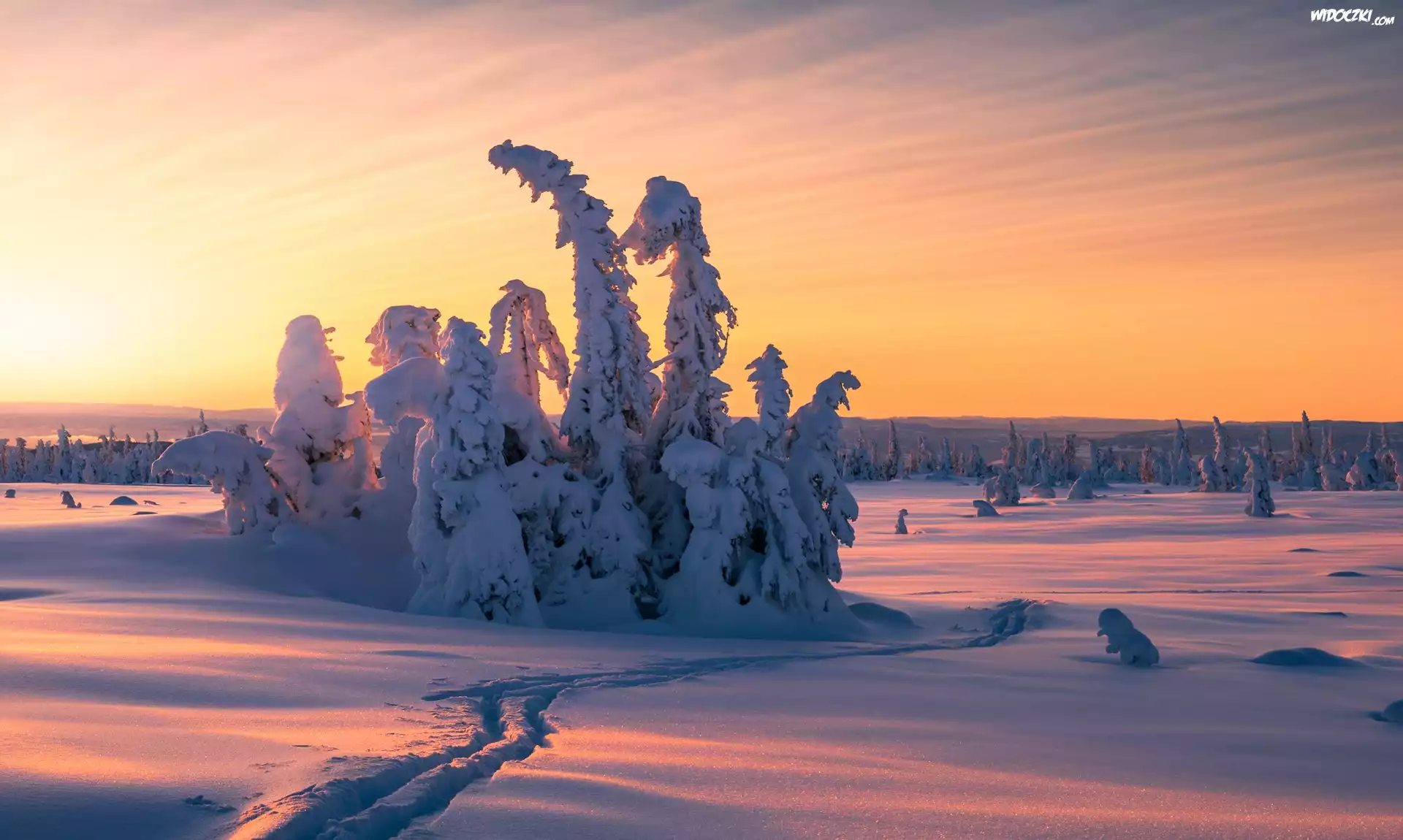 Zdjęcia, Zima, Ślady, Śnieg, Ośnieżone, Drzewa, Wschód słońca