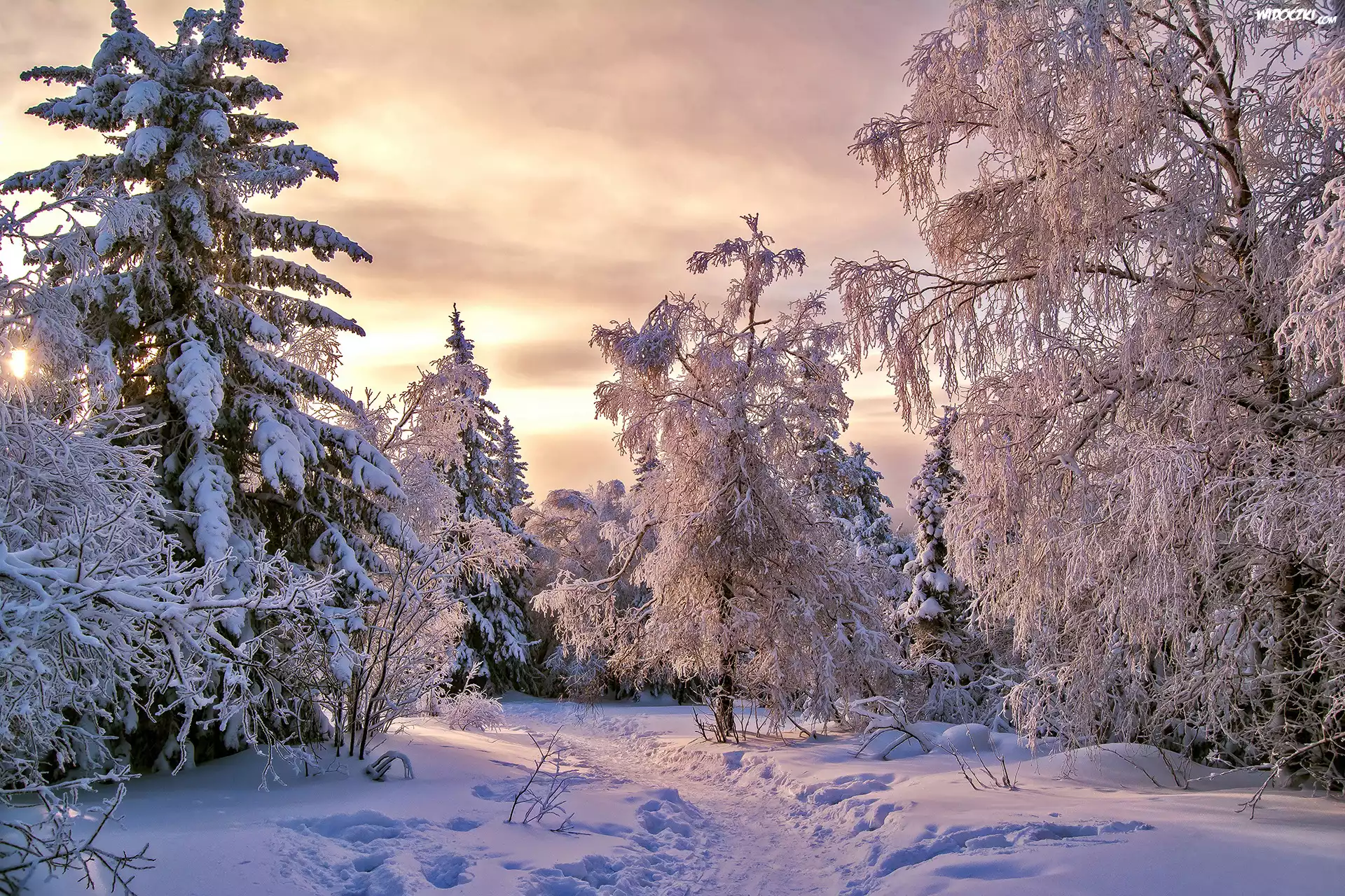 Zima, Ośnieżone, Drzewa, Wschód słońca, Chmury, Ścieżka
