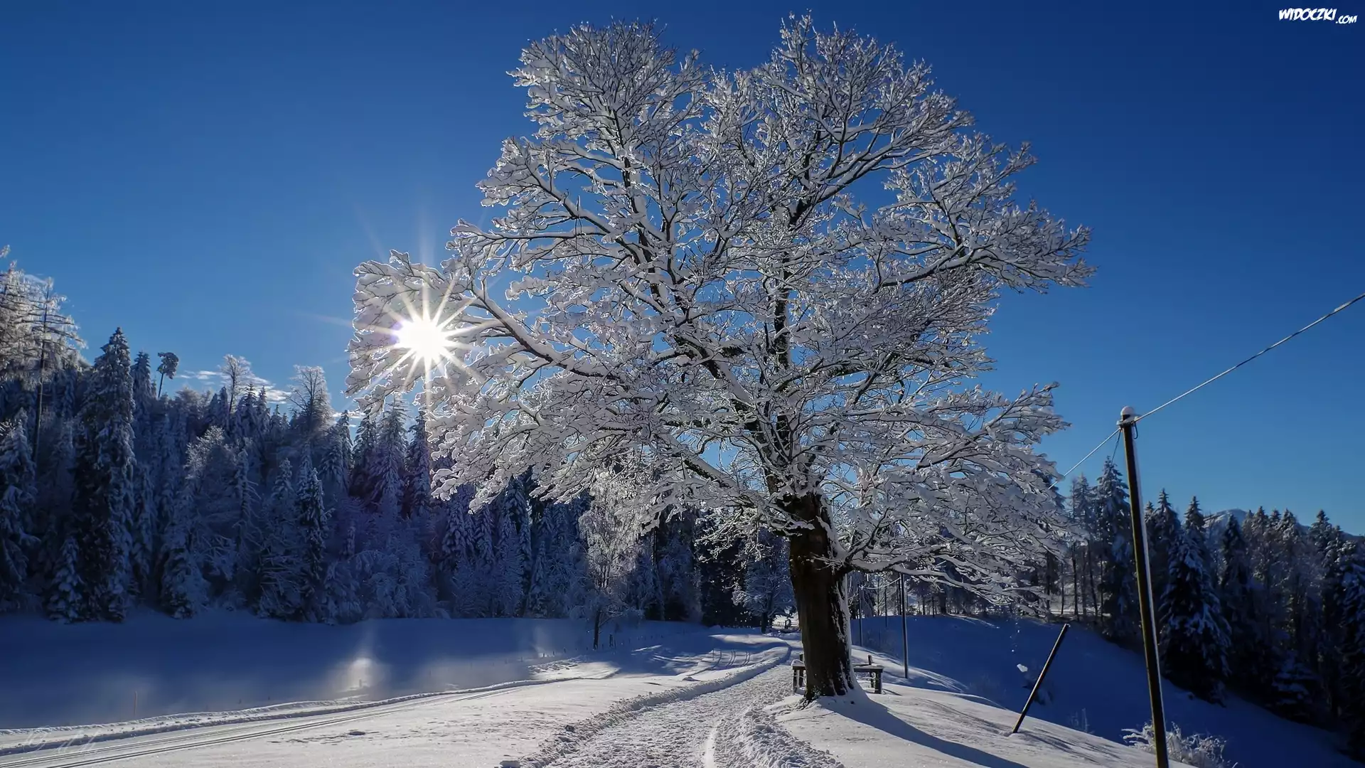 Zima, Ośnieżone, Drzewa , Promienie, Słońca, Śnieg ,Droga