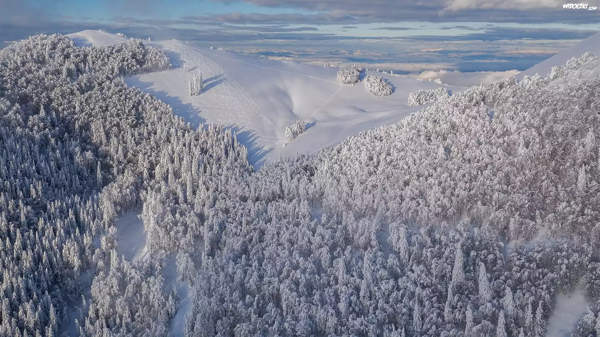 Zdjęcia, Zima, Ośnieżone, Drzewa, Góry, Z lotu ptaka