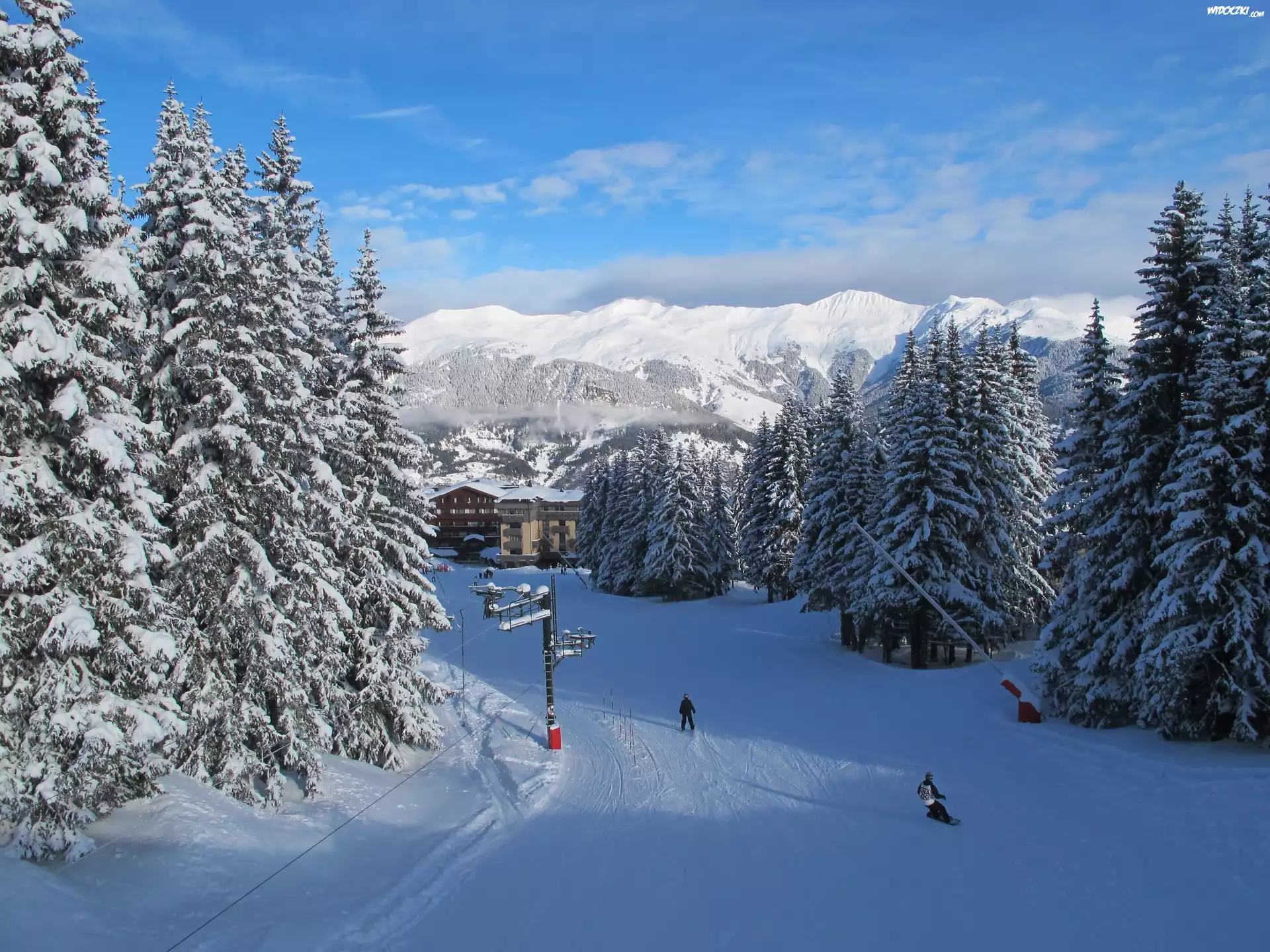 Ośrodek narciarski Courchevel, Góry, Alpy, Lasy, Ośnieżone, Drzewa, Zima, Miejscowość, Saint-Bon-Tarentaise, Sabaudia, Francja |