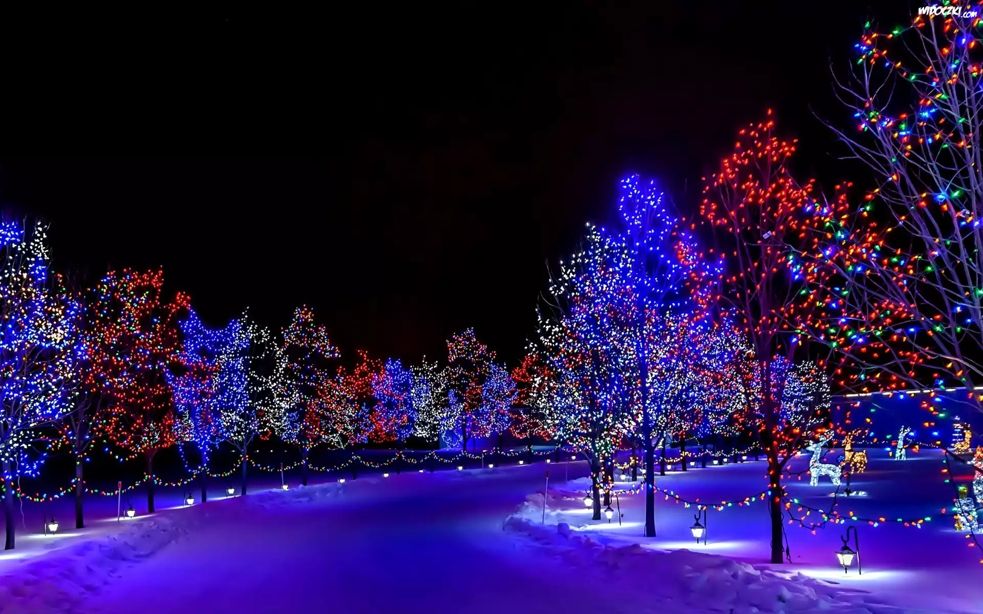 Zdjęcia, Oświetlona, Droga, Drzewa, Lampki, Zima