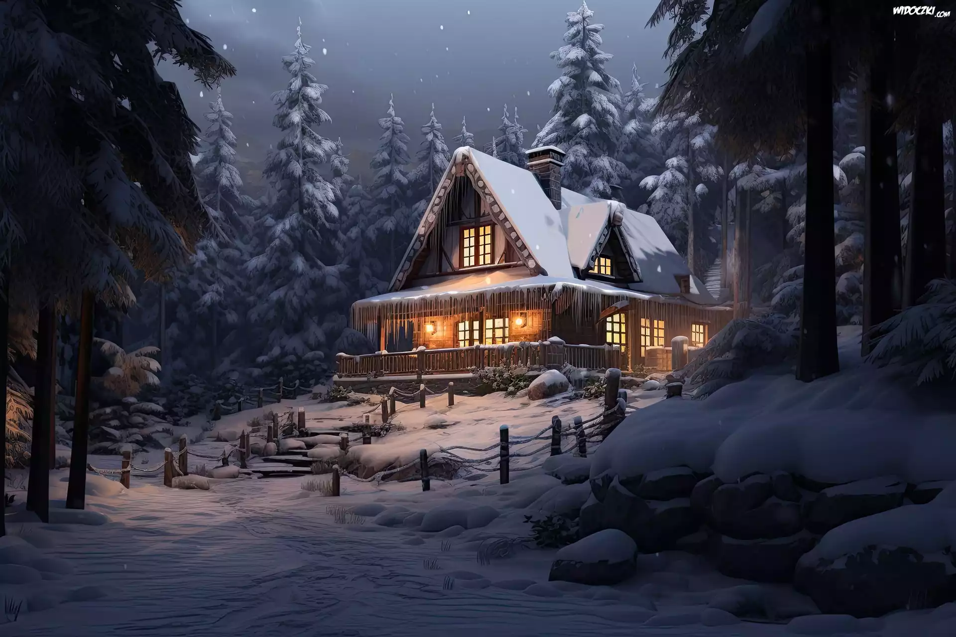 Zdjęcia, Zima, Las, Drzewa, Oświetlony, Dom, Grafika
