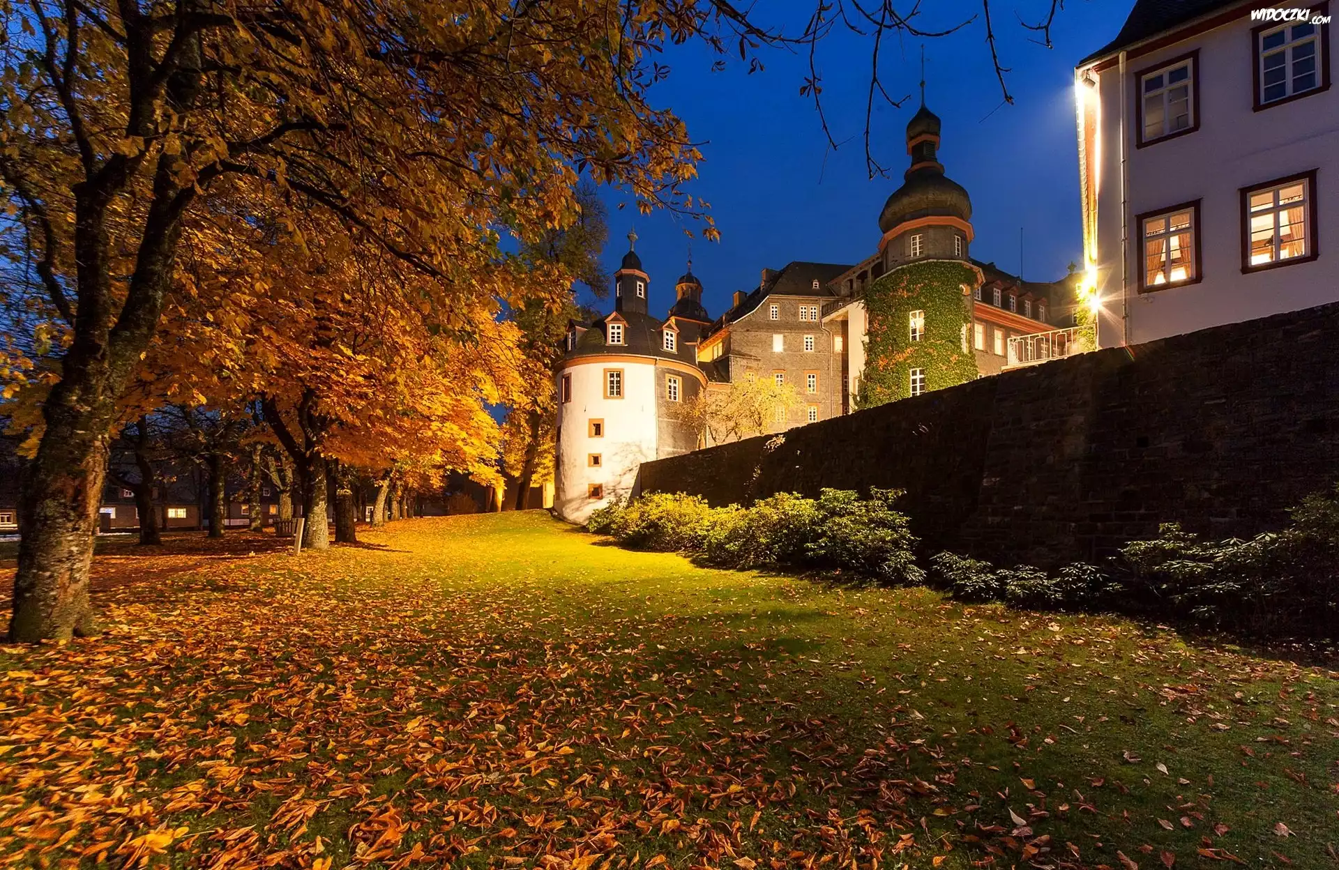Zdjęcia, Oświetlony, Zamek Berleburg, Miasto Bad Berleburg, Niemcy, Jesień