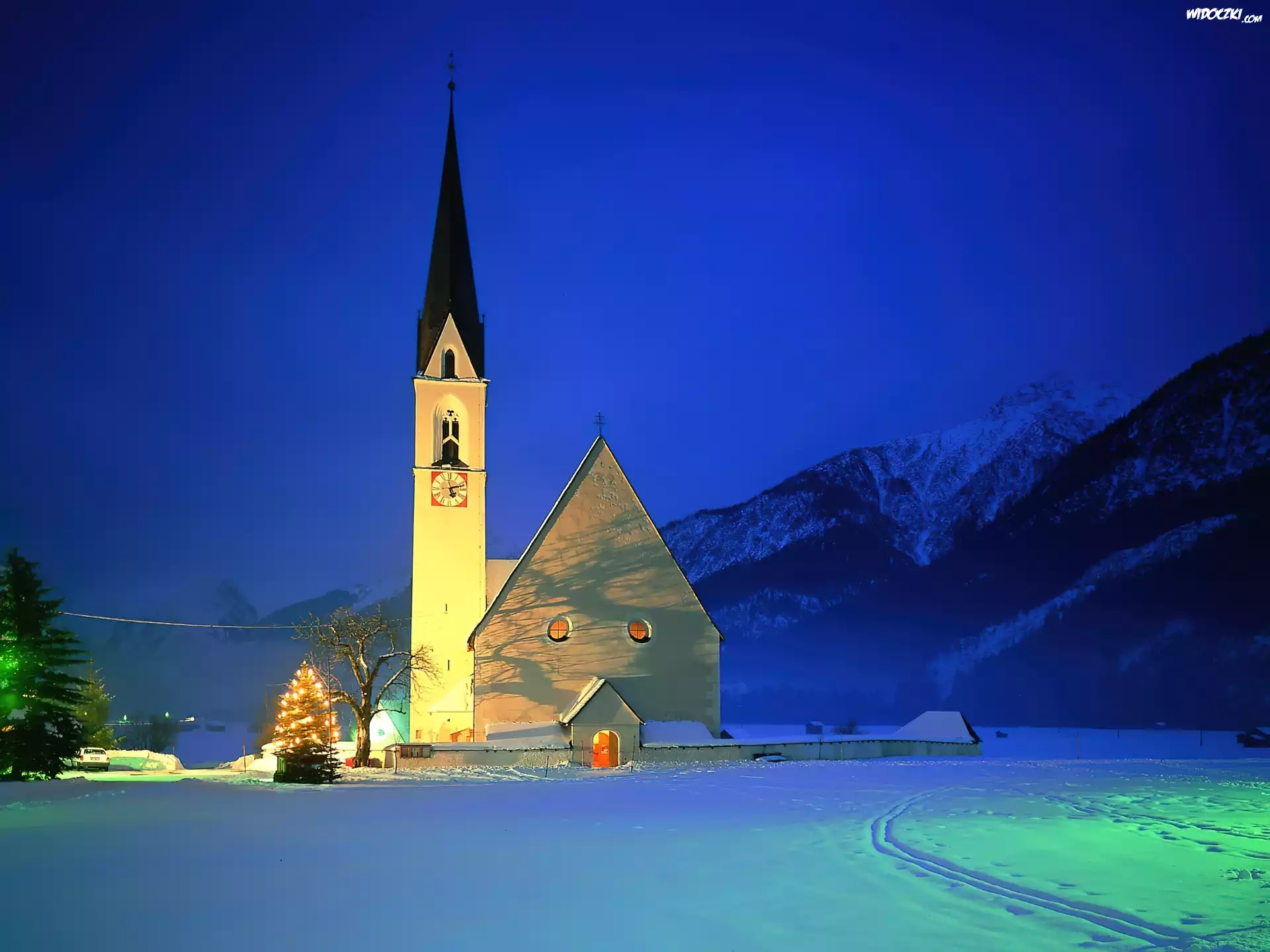 Zdjęcia, Oświetlony, Kościółek, Choinka, Śnieg, Góry