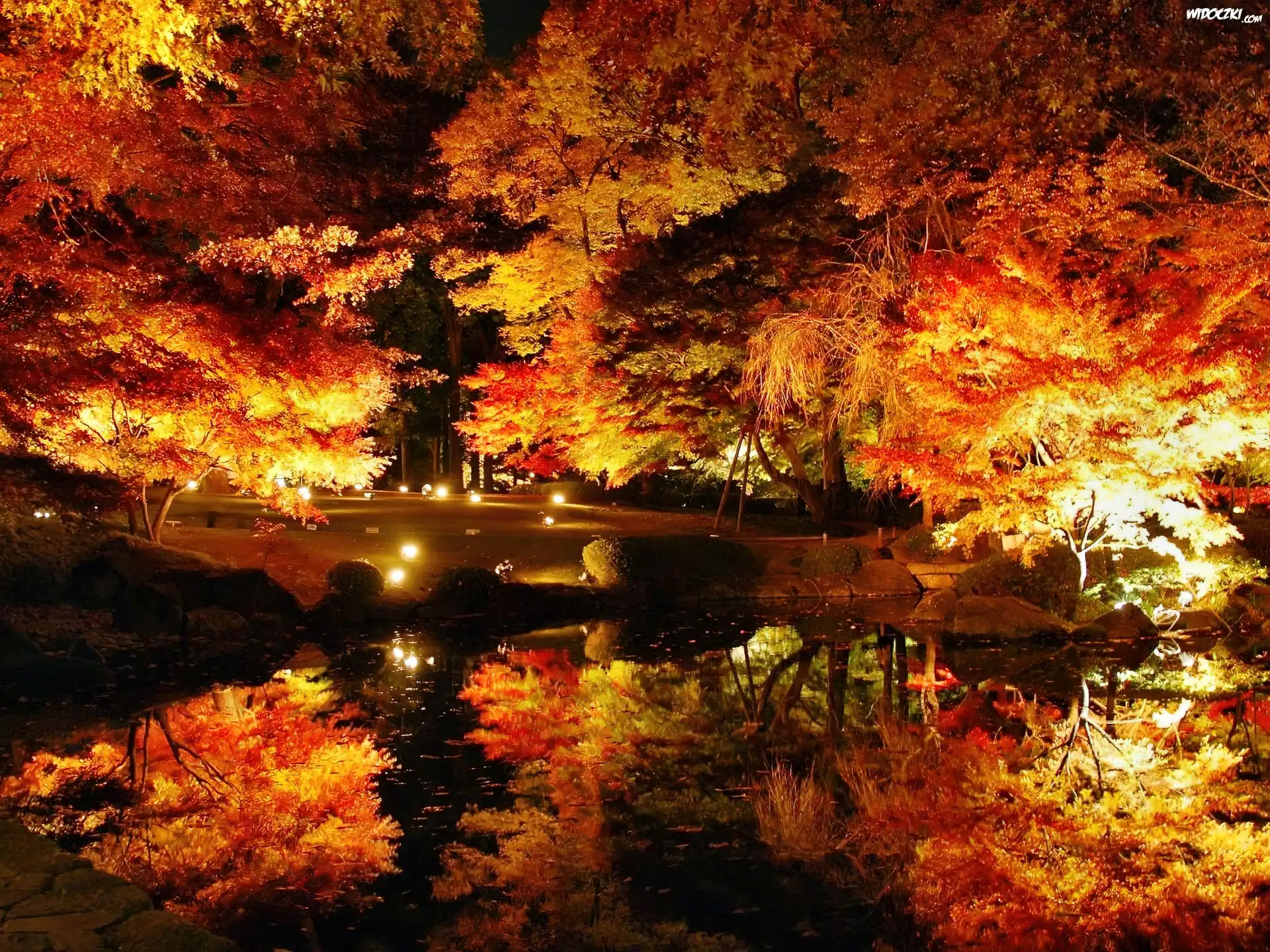 Zdjęcia, Oświetlony, Park, Staw, Odbicie