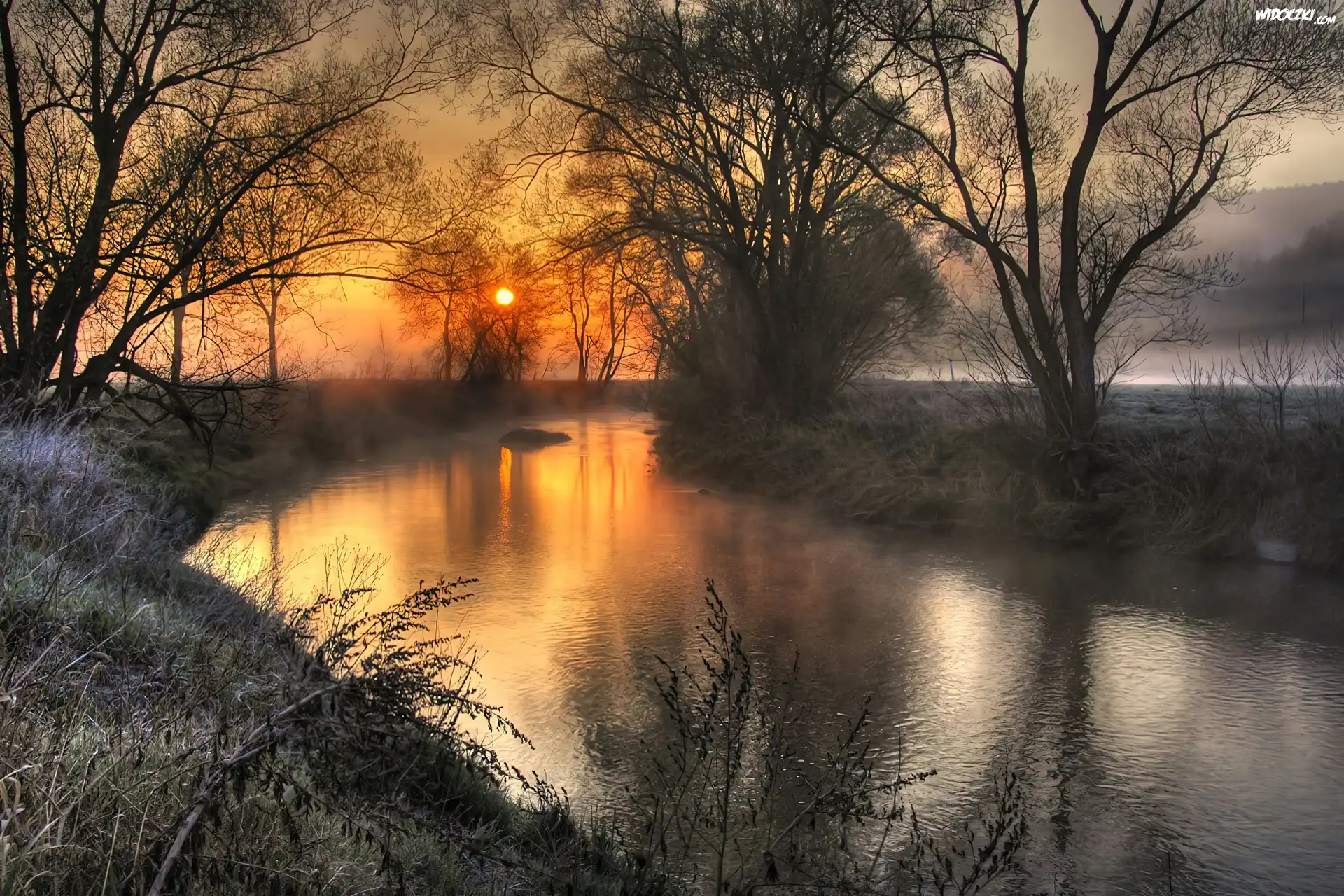 Zdjęcia, Oszroniona, Trawa, Rzeka, Zachód, Słońca