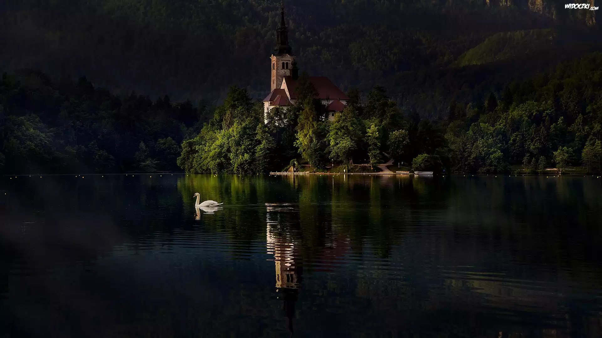 Zdjęcia, Słowenia, Jezioro Bled, Wyspa Blejski Otok, Kościół Zwiastowania Marii Panny, Wieczór, Łabędź