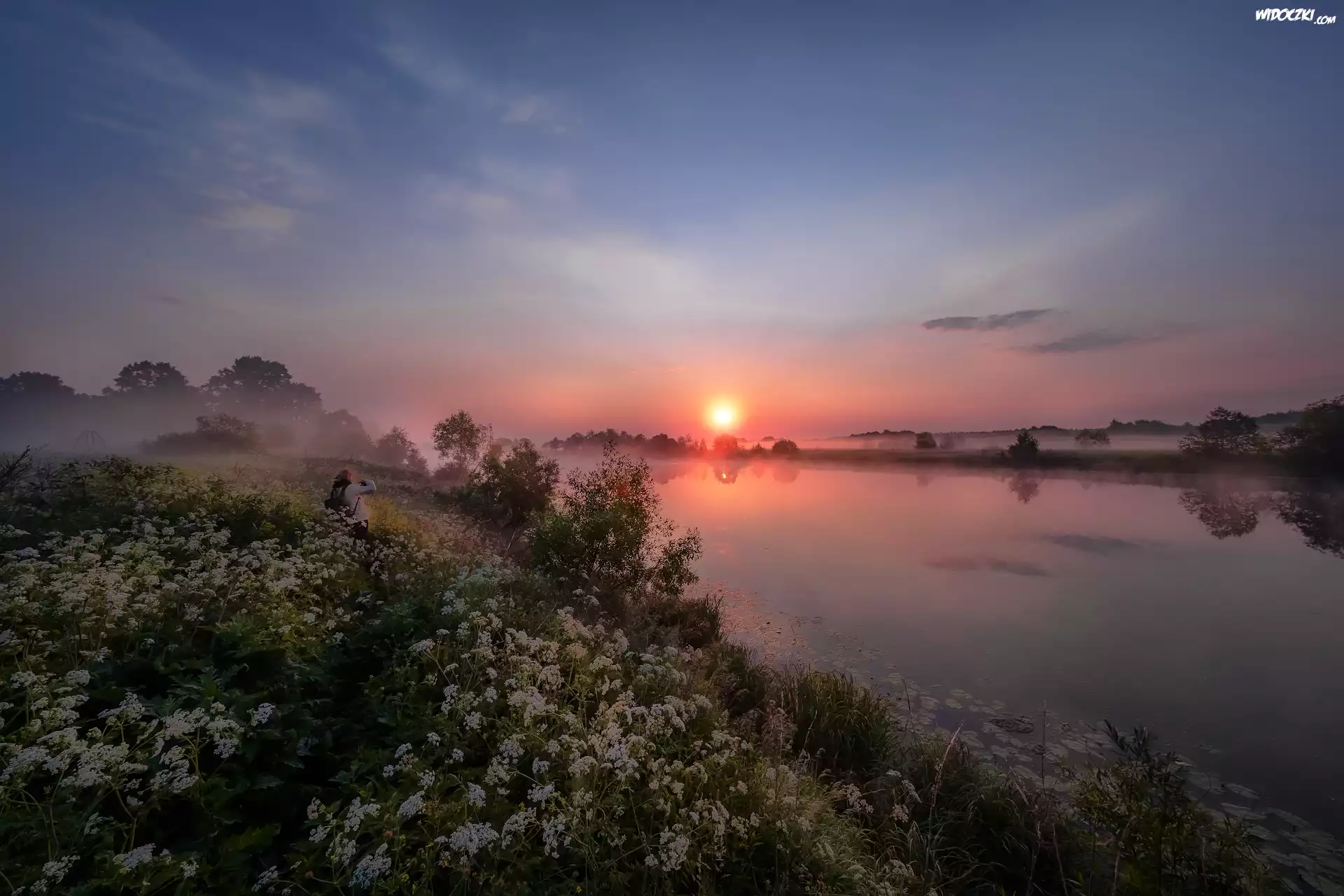 Zdjęcia, Rzeka Dubna, Drzewa, Kwiaty, Mgła, Wschód słońca, Łatgalia, Łotwa
