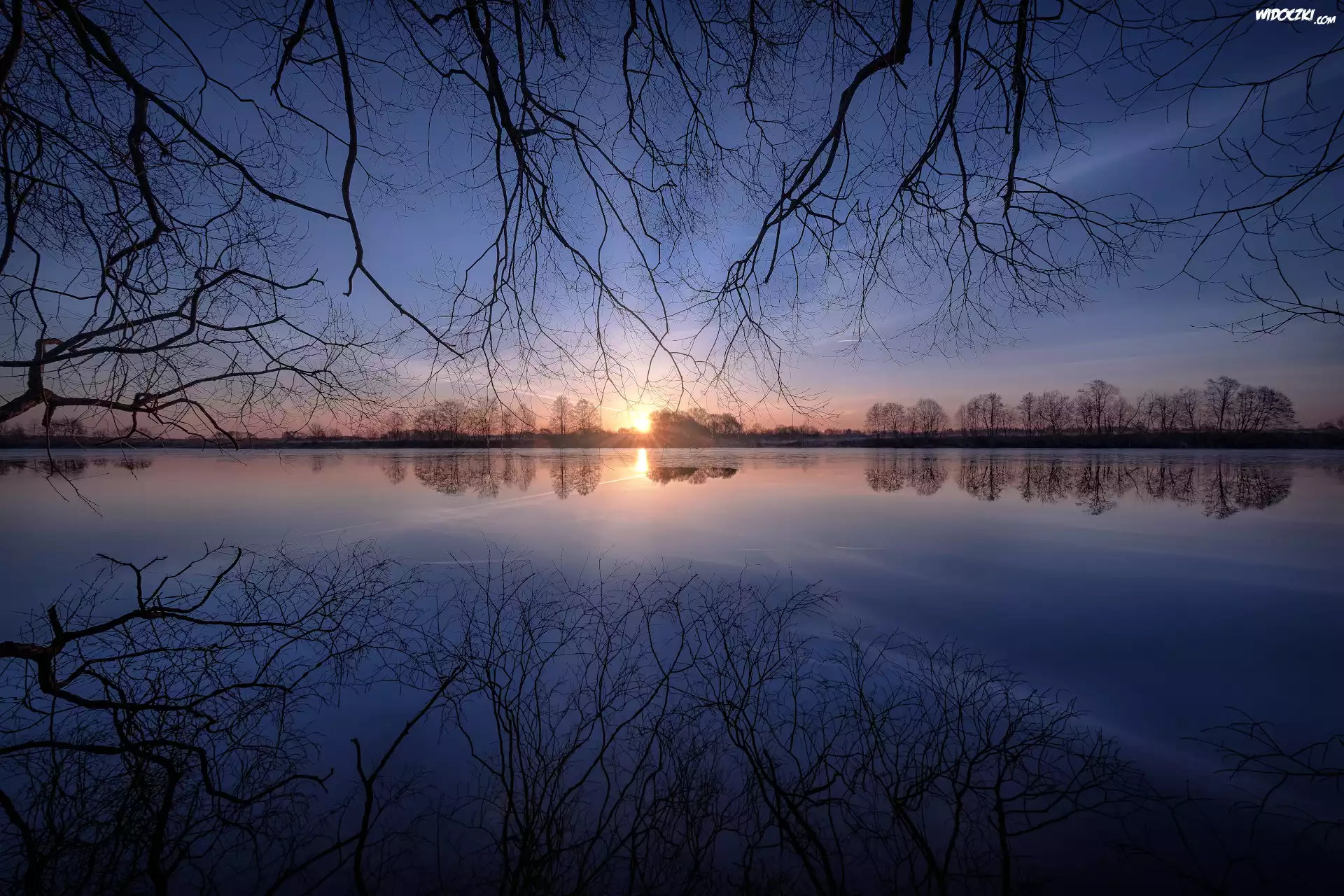 Poranek, Wschód słońca, Drzewa, Rzeka Dubna, Gałęzie, Odbicie, Łatgalia, Łotwa