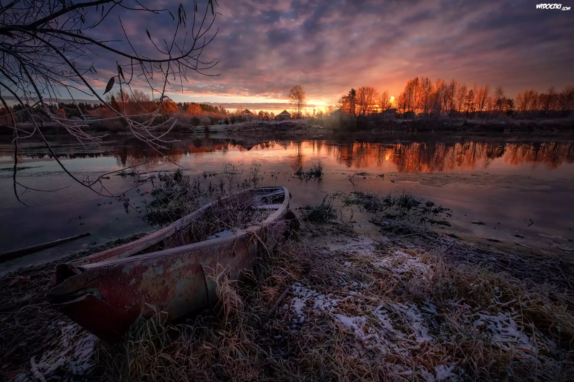 Zdjęcia, Rzeka Dubna, Łódka, Zachód słońca, Zima, Domy, Drzewa, Łatgalia, Łotwa