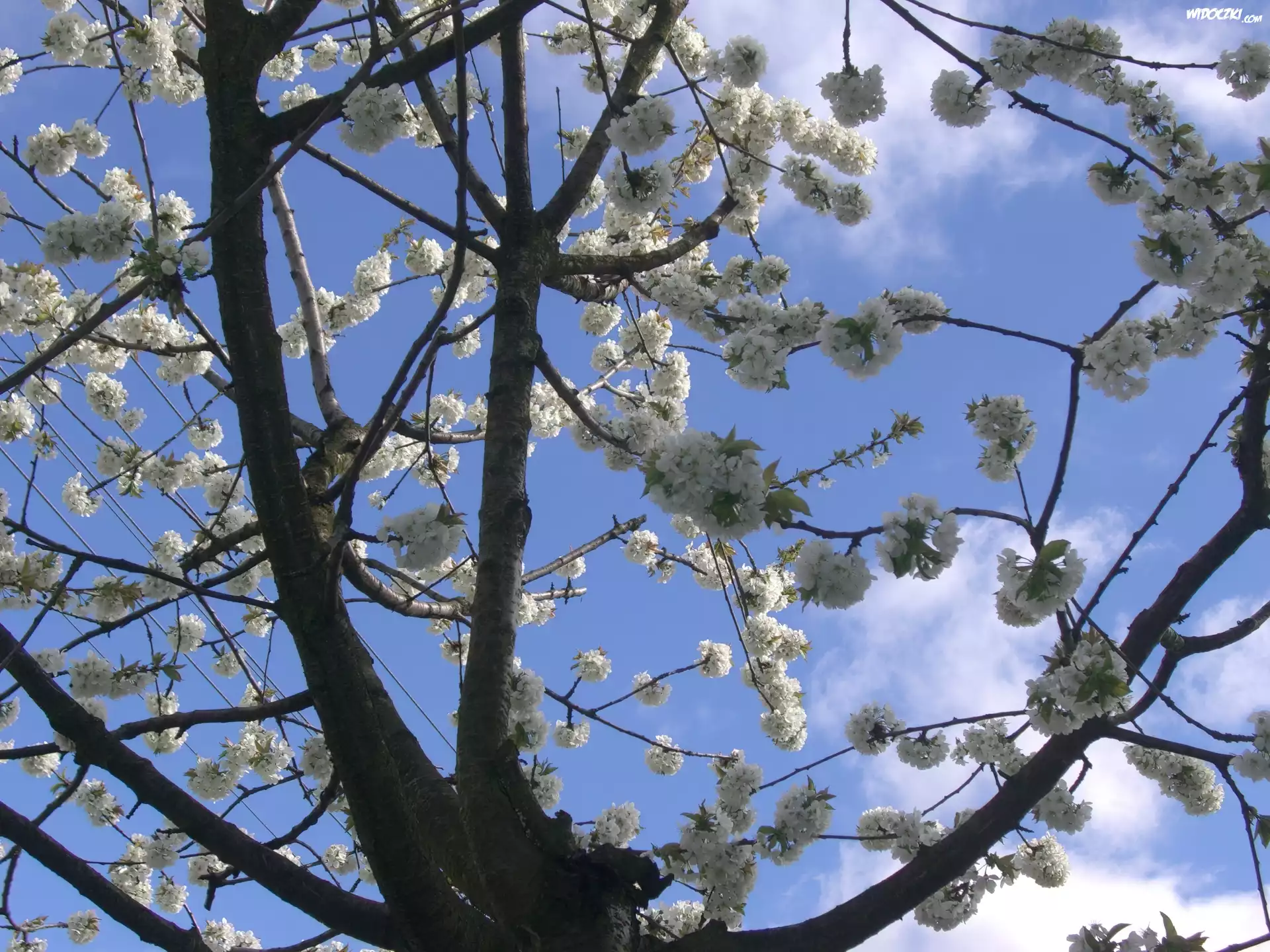 Zdjęcia, Drzewo, Owocowe, Czereśnia, Kwiaty, Białe, Niebo, Chmury