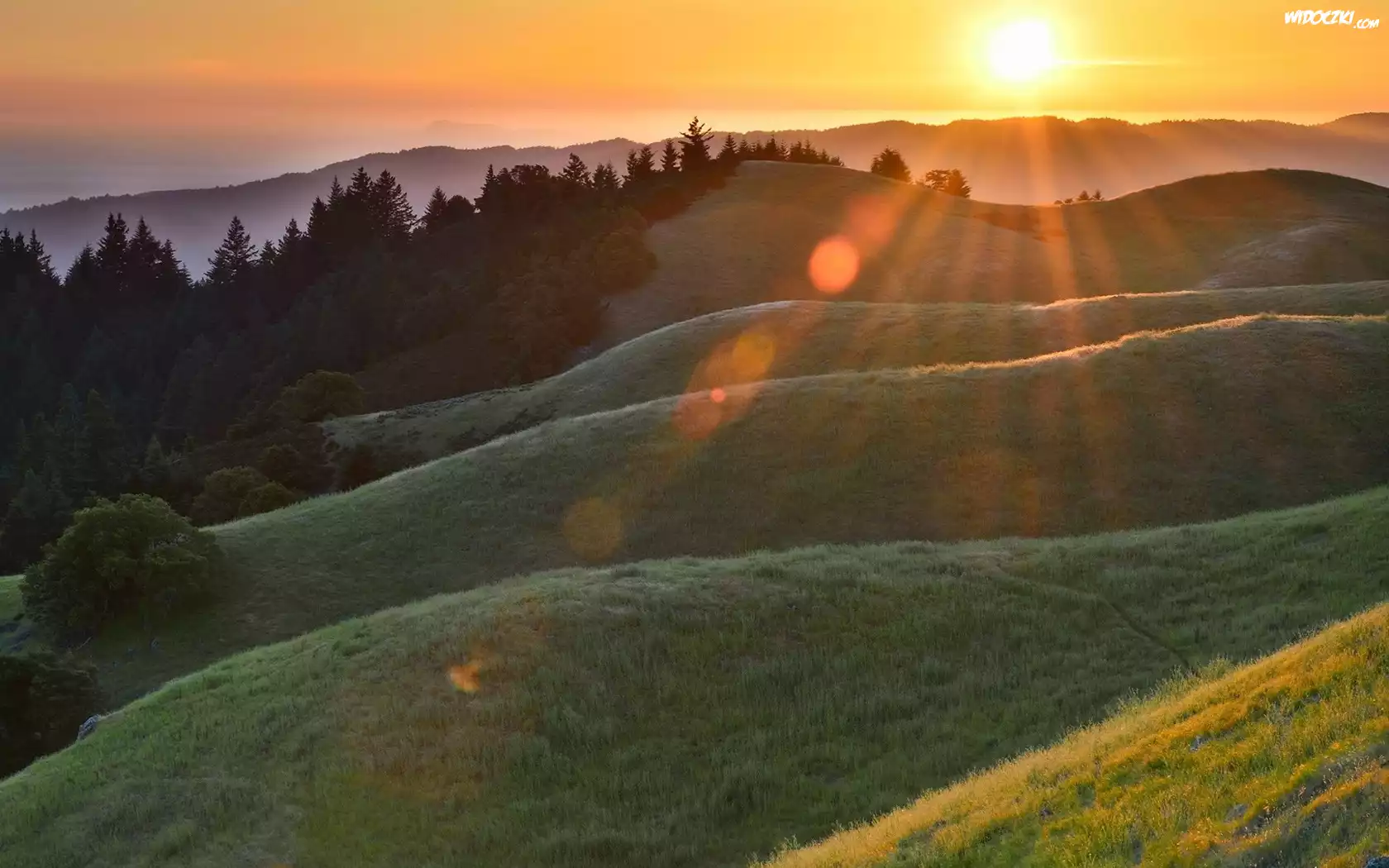 Zdjęcia, Pagórki, Łąki, Lasy, Promienie, Słoneczne