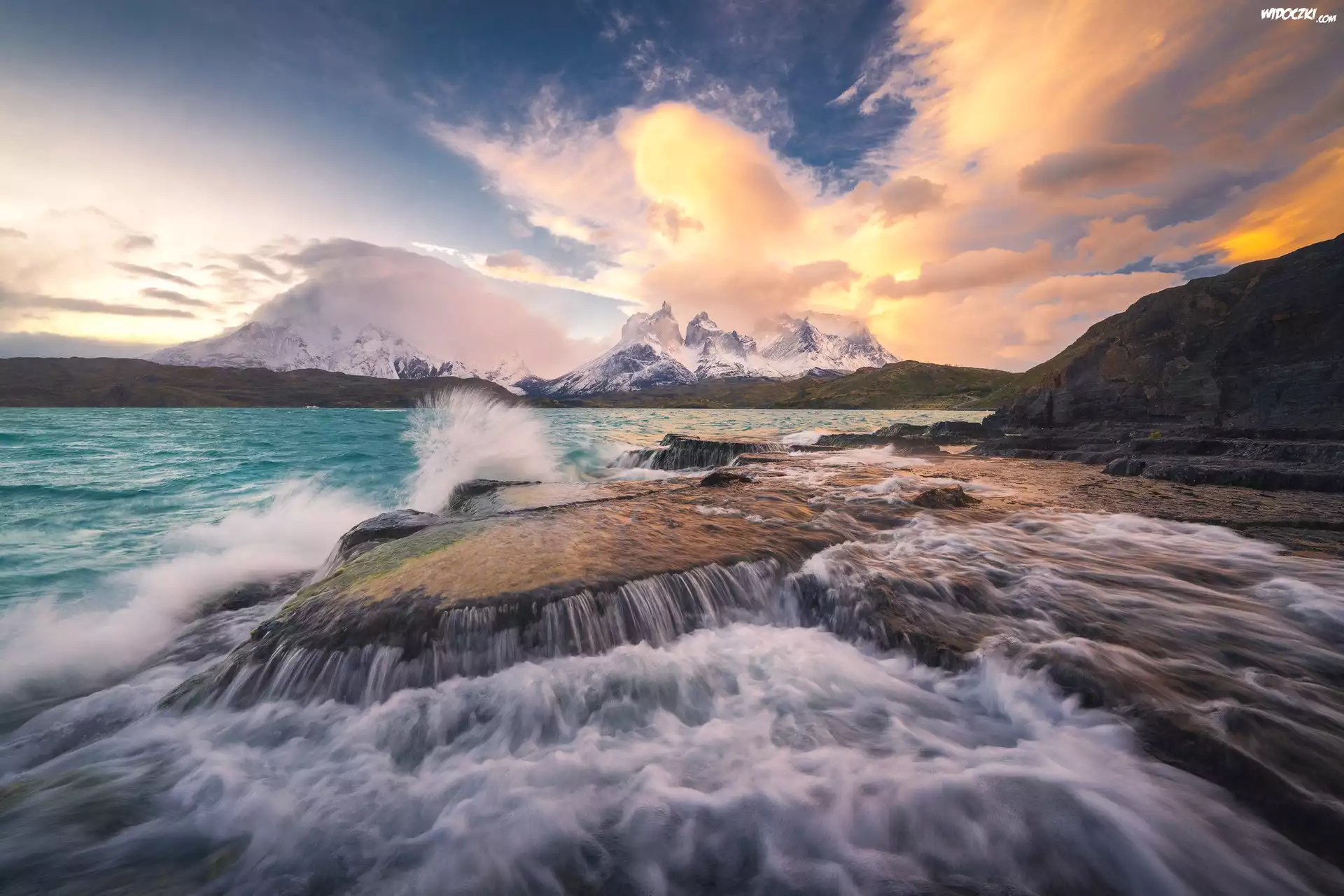 Chile, Park Narodowy Torres del Paine, Jezioro, Pehoe Lake, Wybrzeże, Skały, Fale, Góry, Paine Grande, Zachód słońca, Chmury |