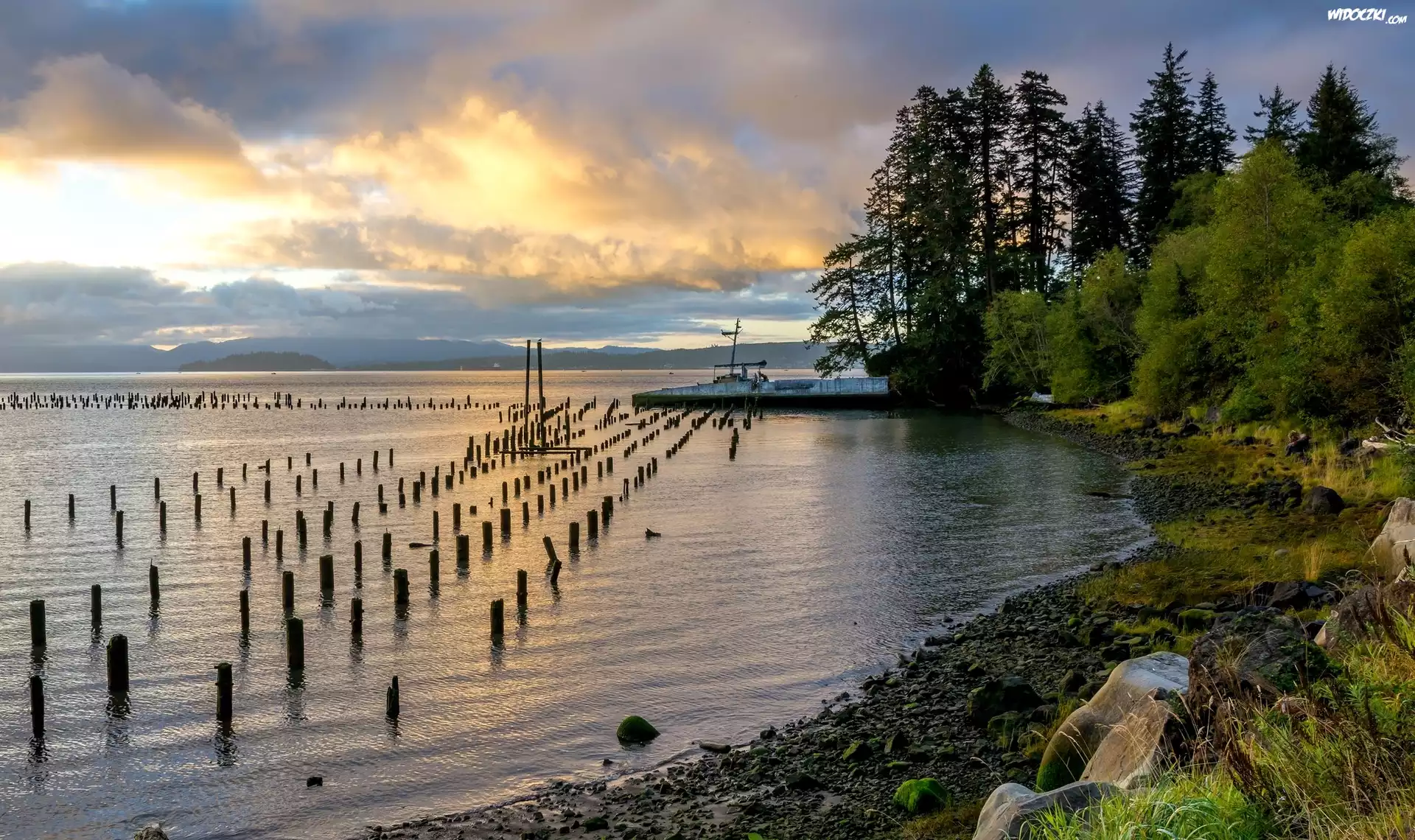 Zdjęcia, Jezioro, Pale, Brzeg, Kamienie, Drzewa, Wschód, Słońca