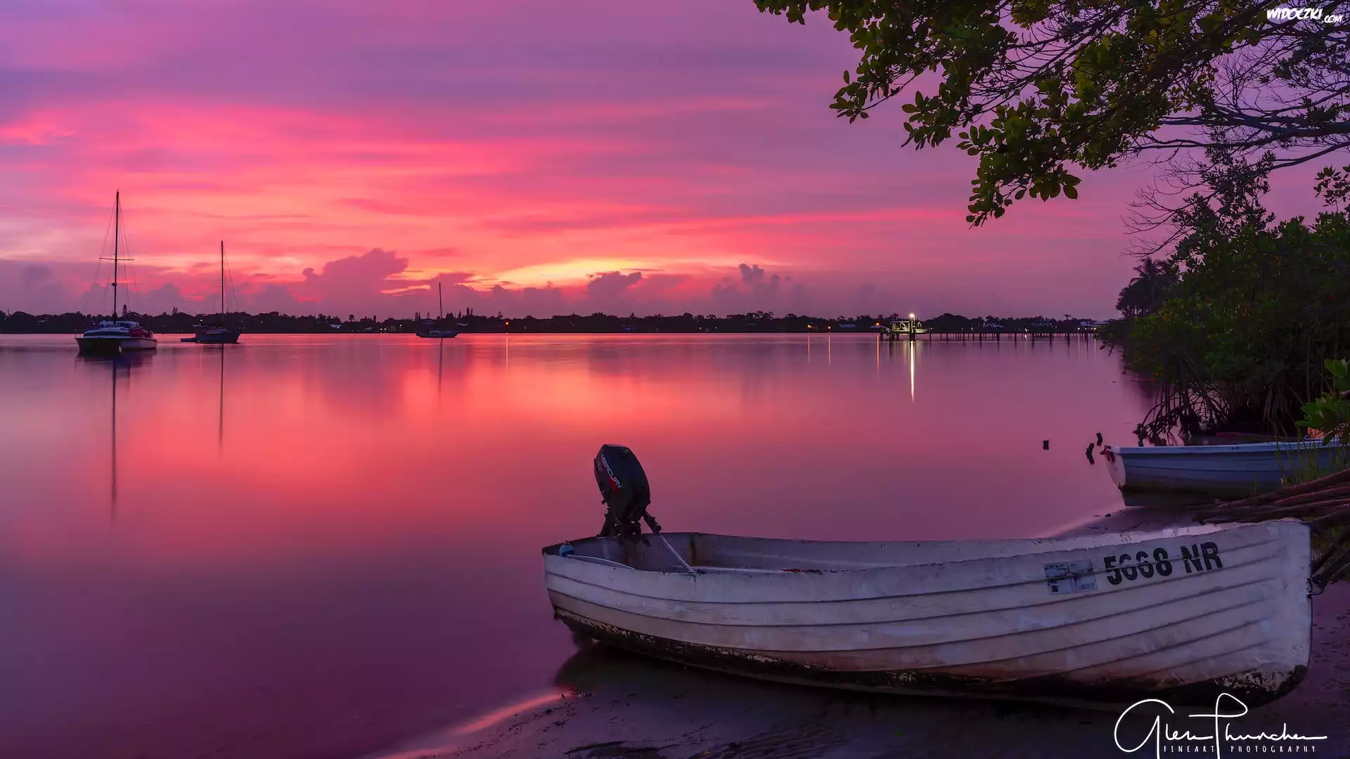 Zdjęcia, Wschód słońca, Jezioro, Żaglówki, Łódka, Drzewo, Palm City, Floryda, Stany Zjednoczone