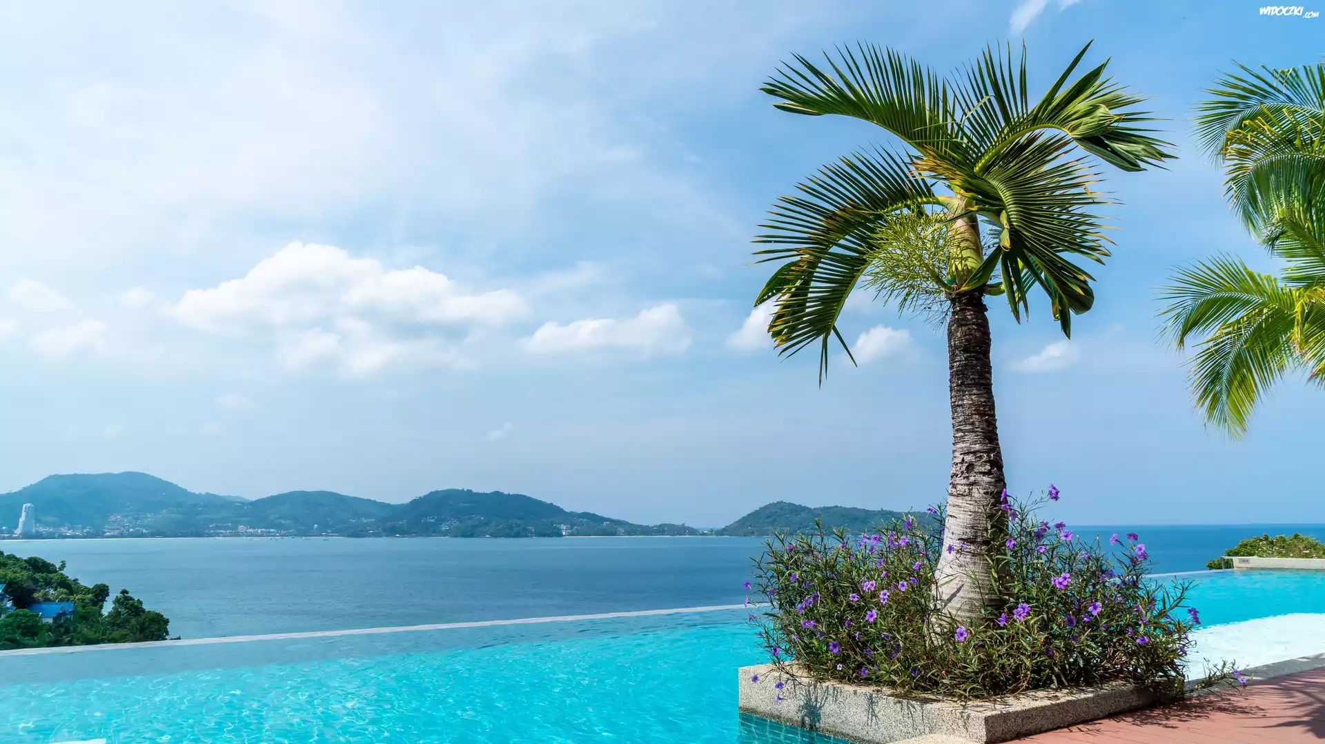 Zdjęcia, Palmy, Morze, Góry, Basen, Kwiaty