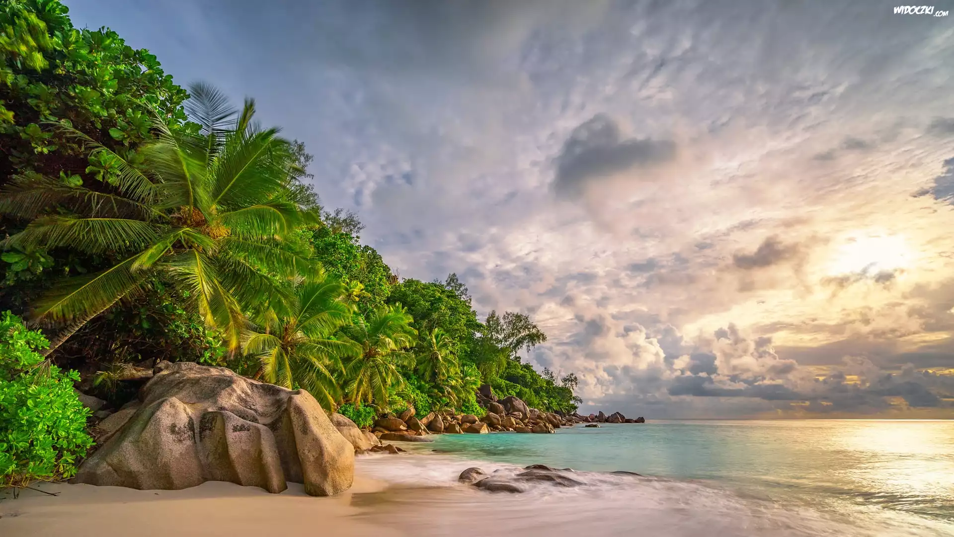 Seszele, Morze, Plaża, Palmy, Skały, Chmury