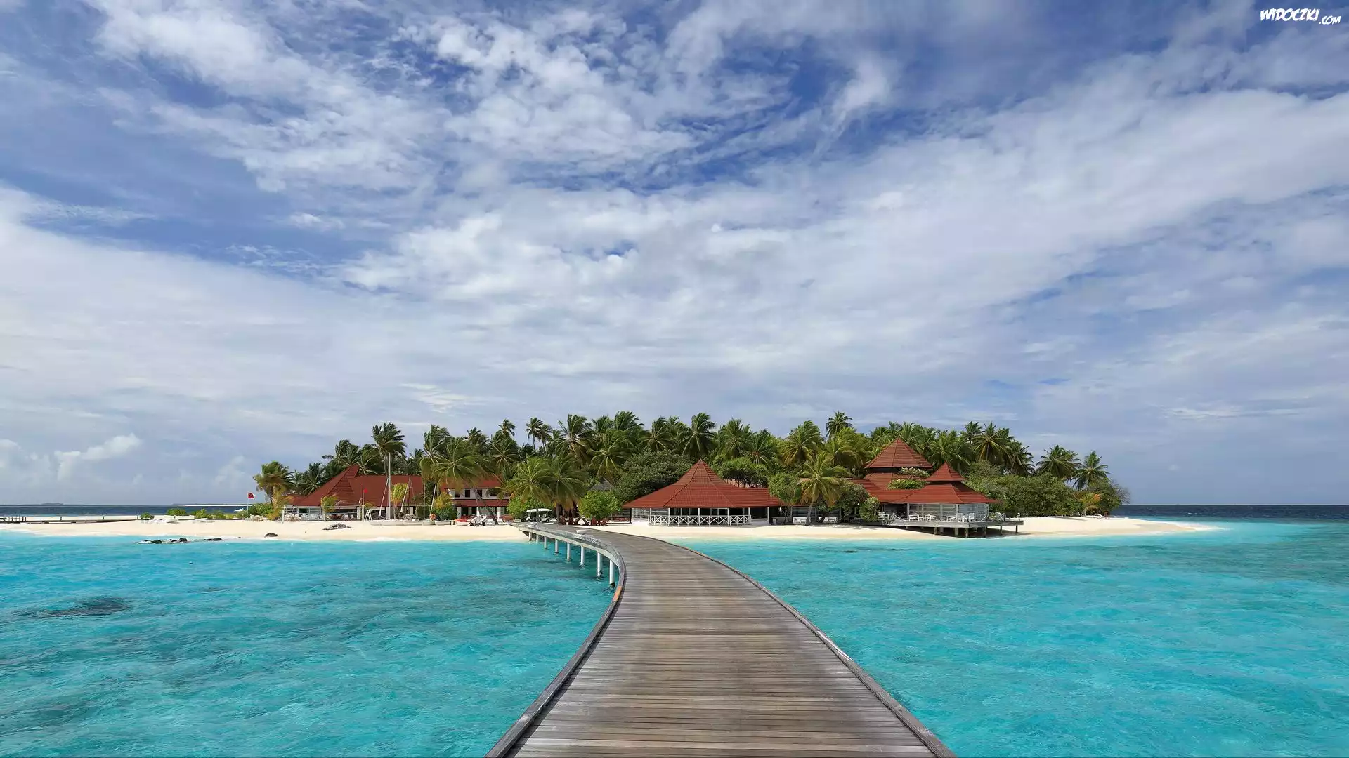 Zdjęcia, Morze, Pomost, Plaża, Palmy, Wyspa, Domki