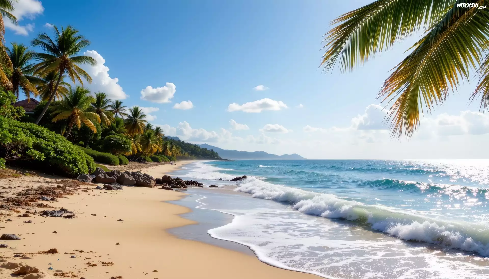 Zdjęcia, Plaża, Palmy, Morze, Tropiki, Grafika