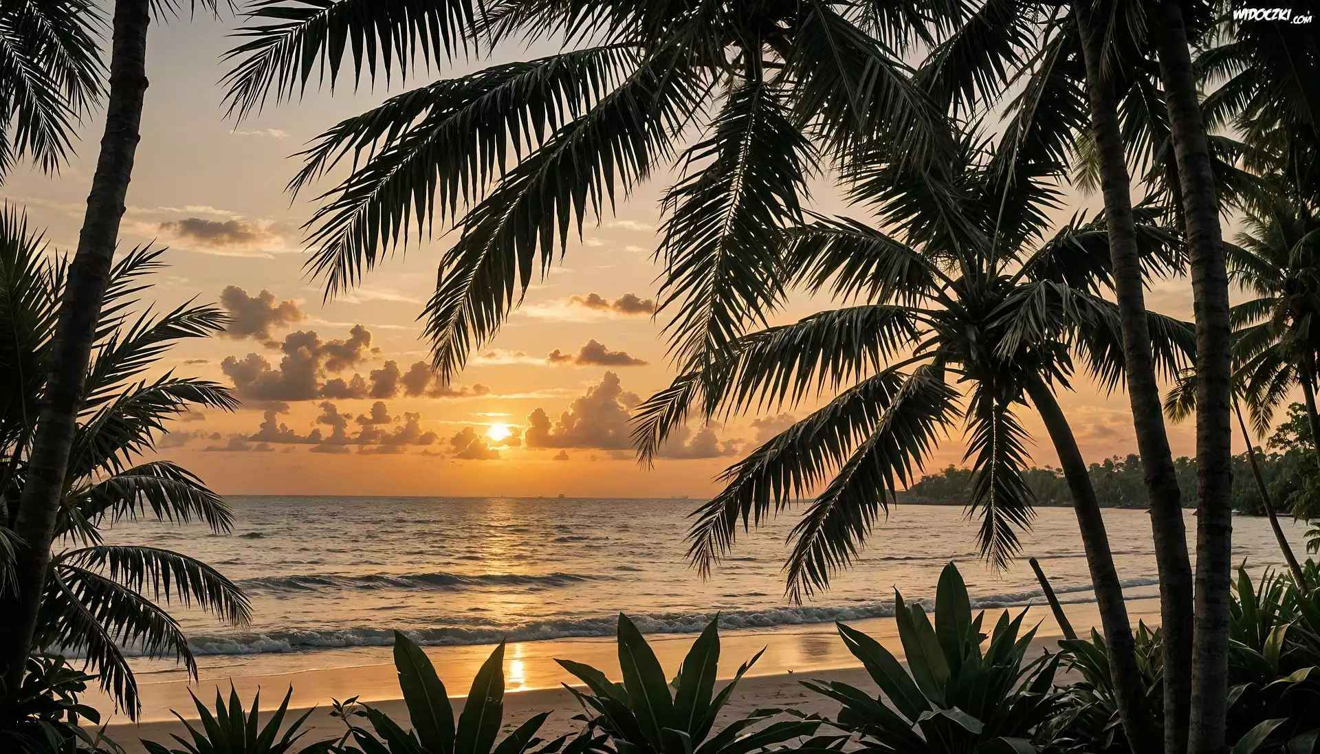 Tropiki, Palmy, Morze, Zachód słońca