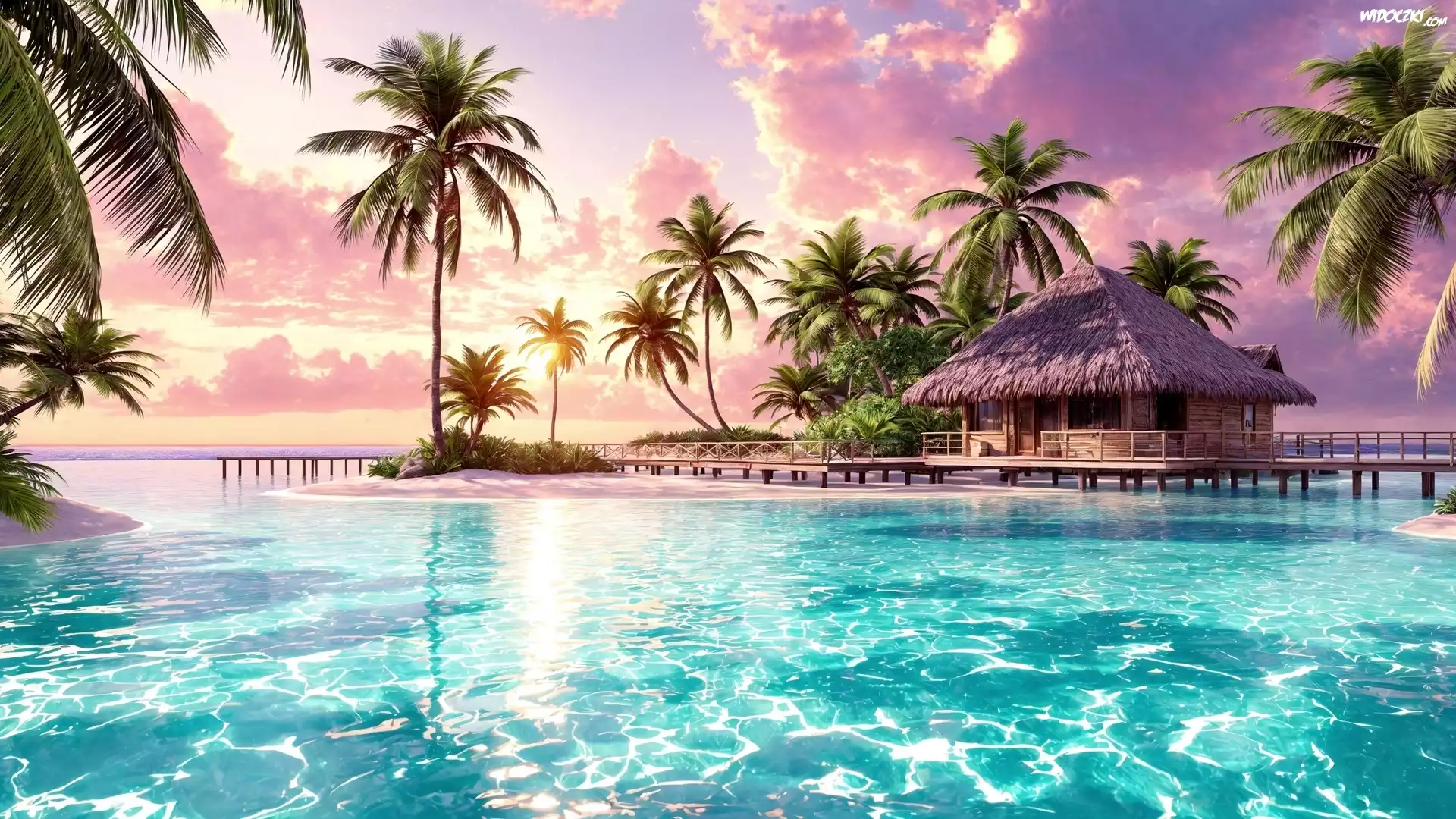 Dom, Na palach, Palmy, Morze, Zachód słońca