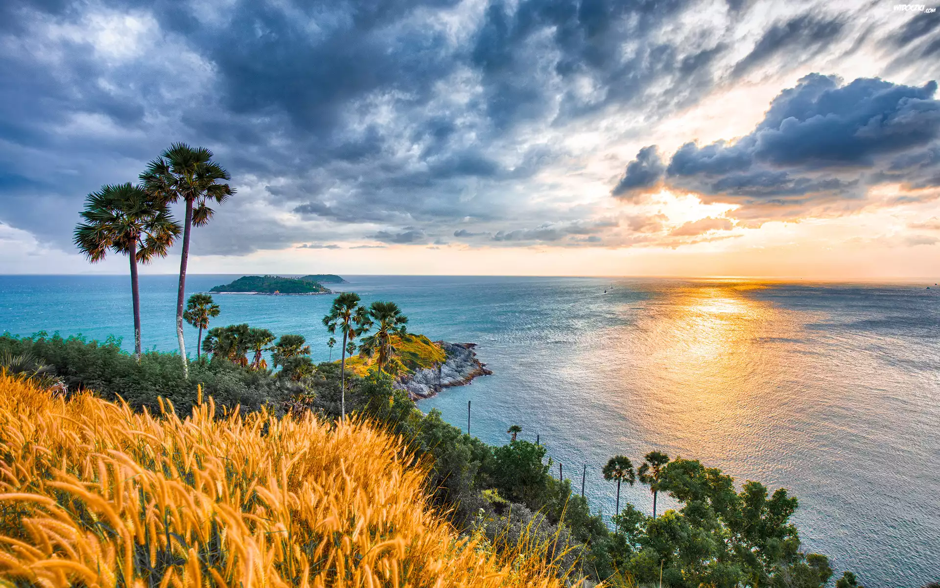 Tajlandia, Przylądek Phromthep, Morze Andamańskie, Chmury, Wschód słońca, Palmy