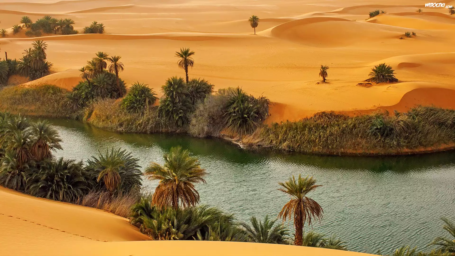 Zdj臋cia, Oaza, Pustynia, Krzewy, Palmy, Woda, Piasek
