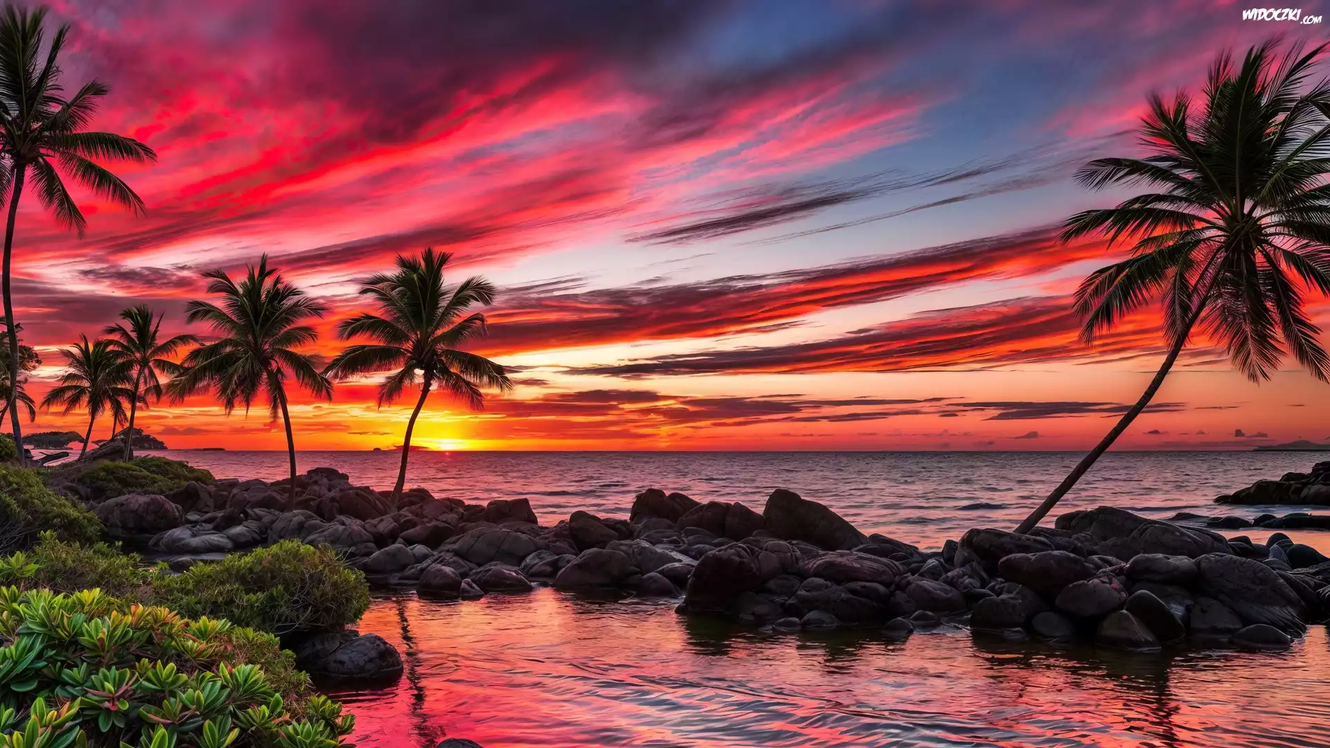 Zdjęcia, Morze, Palmy, Roślinność, Zachód słońca