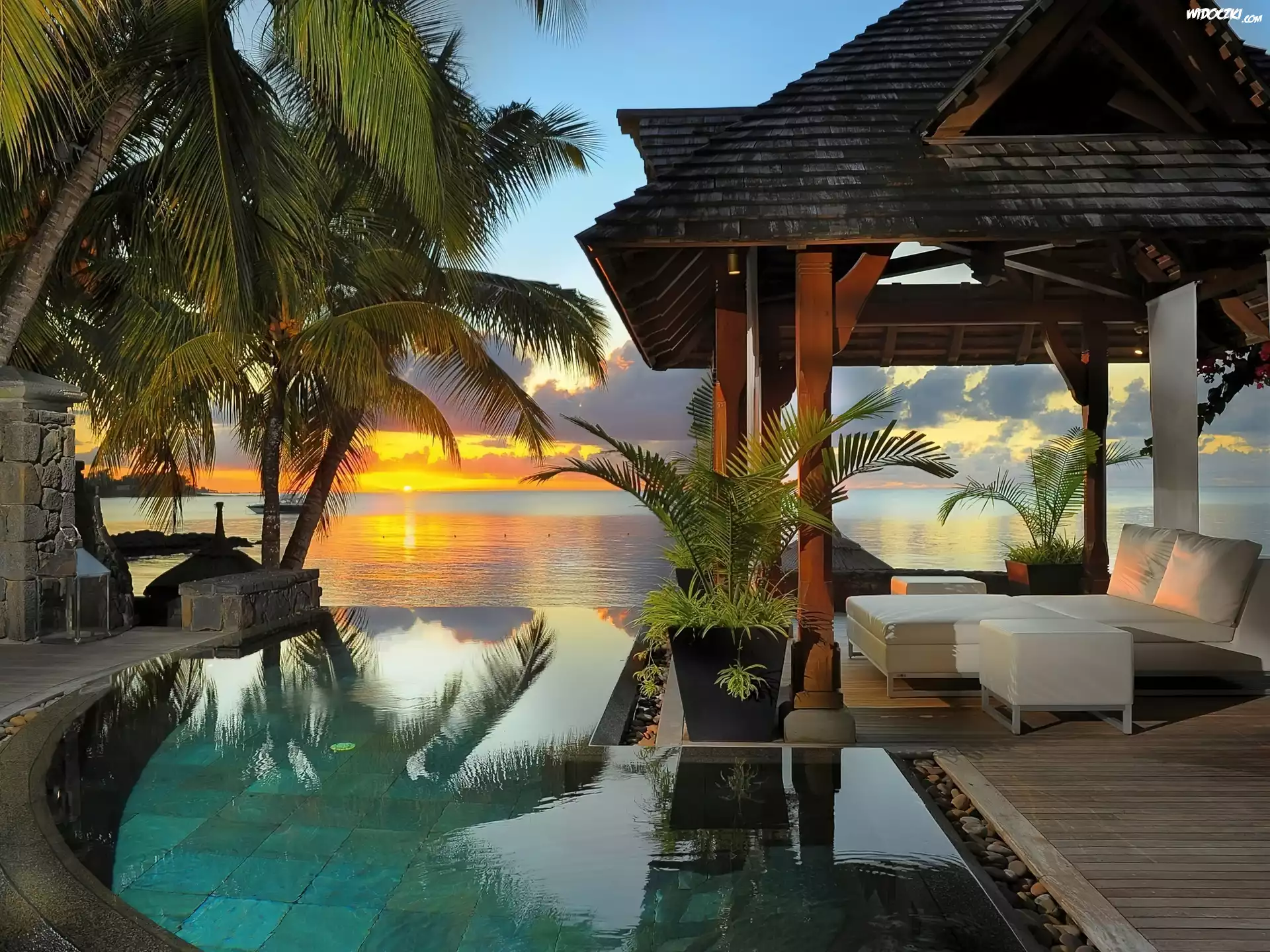 Basen, Palmy, Zadaszenie, Leżaki, Morze, Zachód, Słońca, Wakacje