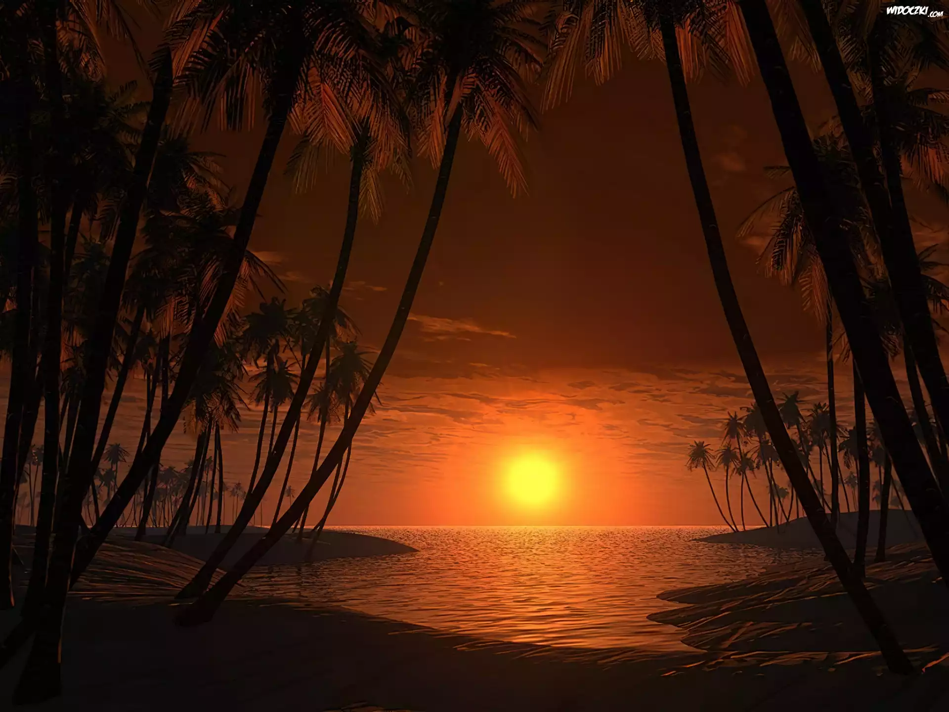 Zdjęcia, Palmy, Zachód, Słońca, Woda, Tropiki