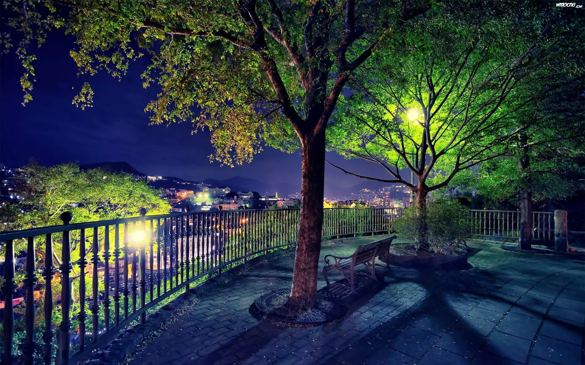 Panorama, Miasta, Drzewa, Ławka
