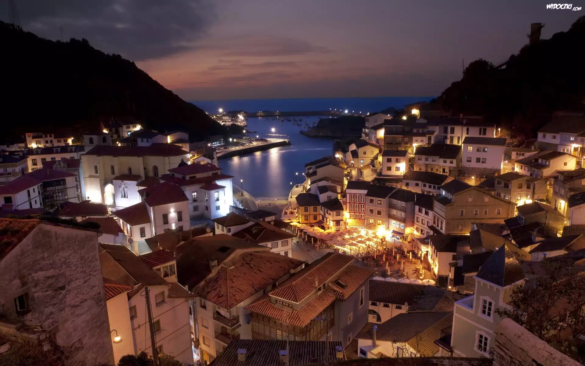 Domy, Panorama, Miasta, Góry, Zatoka, Morze, Hiszpania, Noc